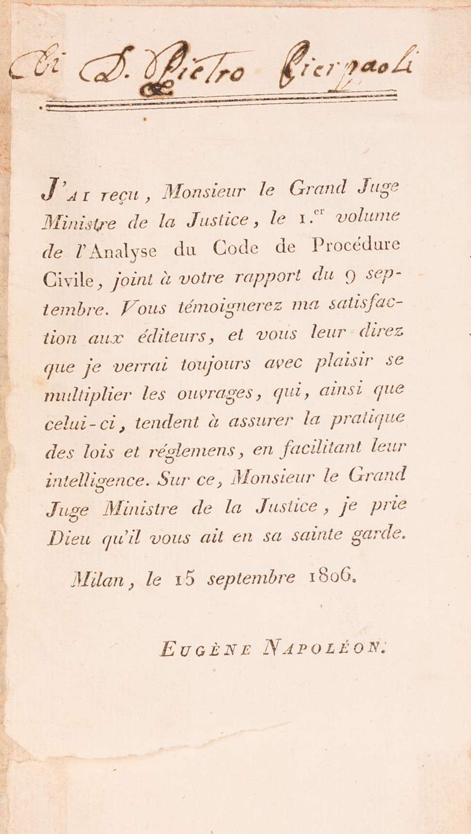 Nota a penna all'antiporta a firma del M. Ricciardi, regnando Gioacchino Napoleone
