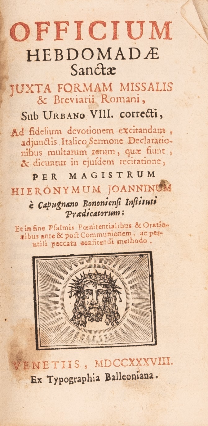 - OFFICIUM HEBDOMADAE SANCTAE juxta formam Missalis et Breviarii Romani Sub Urbano VIII correcti, ad fidelium devotionem excitandam adjunctis italico sermone Declarationibus multarum rerum, quae fiunt et dicuntur in ejusdem recitatione, per Magistrum HIERONYMUM JOANNINUM e Capugnano Bononiensem Instituti Praedicatorum - 1852. Venetiis, apud Sebastianum Tondelli