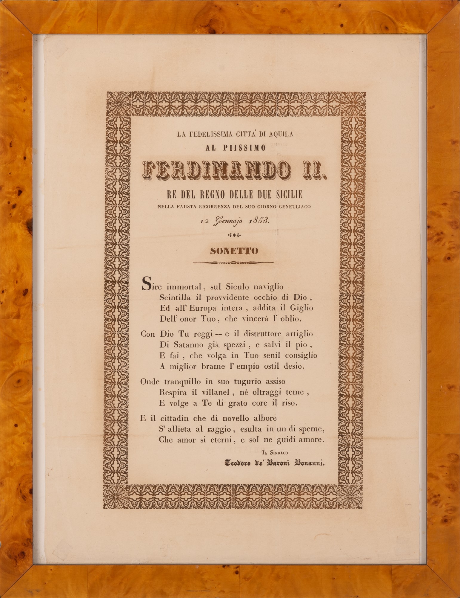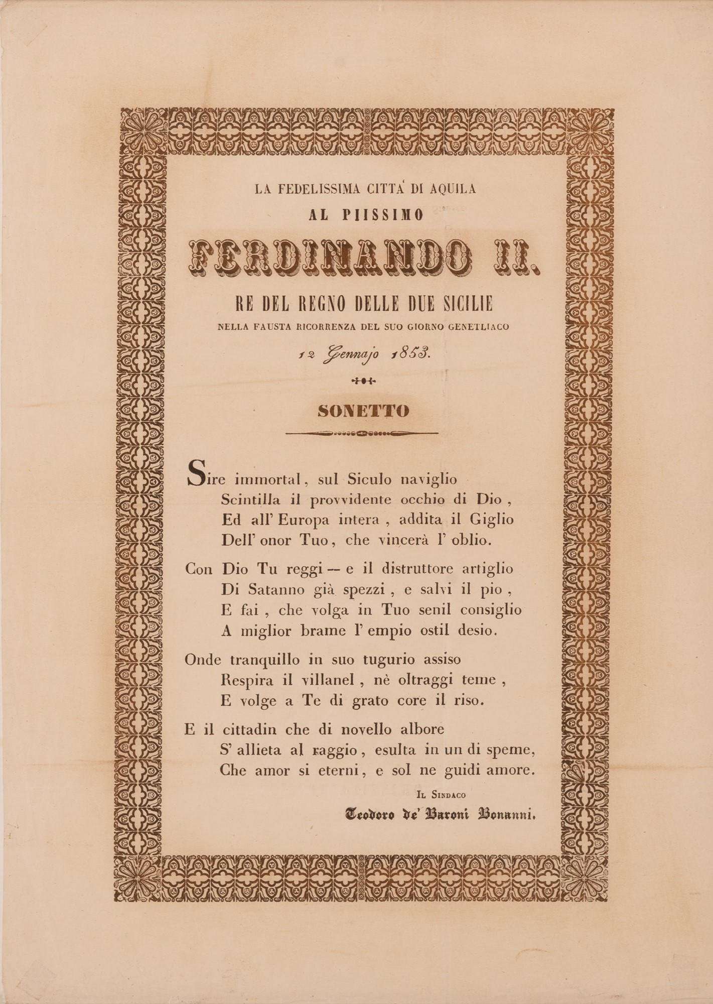 Sonetto La fedelissima città dell'Aquila al piissimo Ferdinando II Re del Regno delle Due Sicilie
