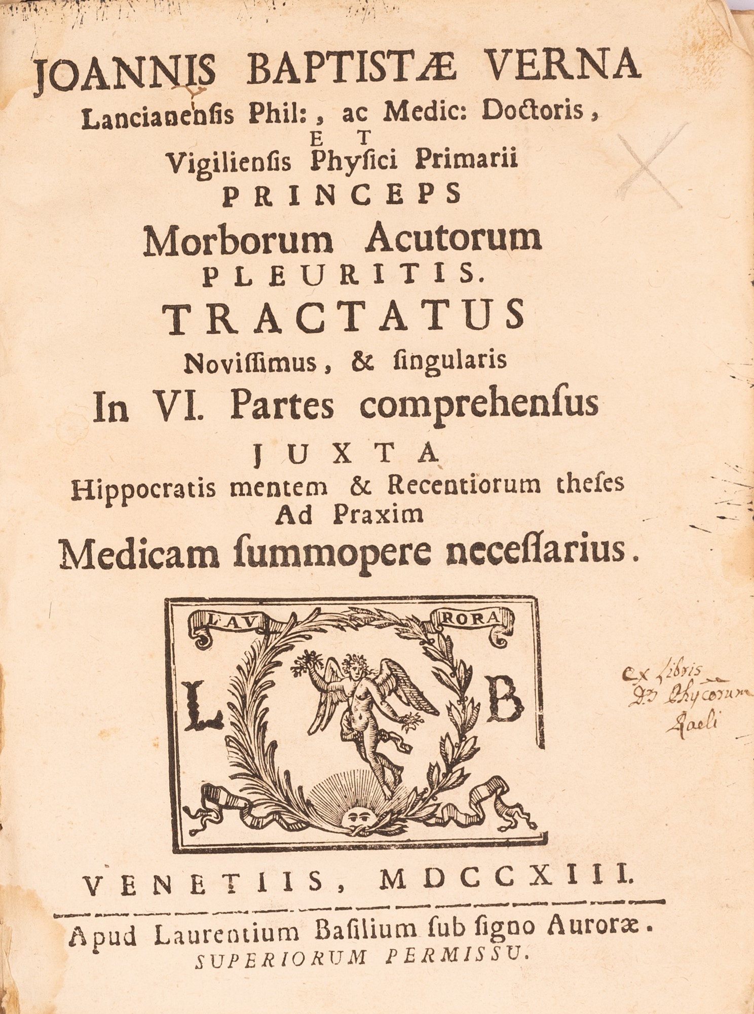 Joannis Baptistae Verna Lancianensis phil., ac med. doctoris, et vigiliensis physici primarii Princeps morborum acutorum pleuritis tractatus novissimus