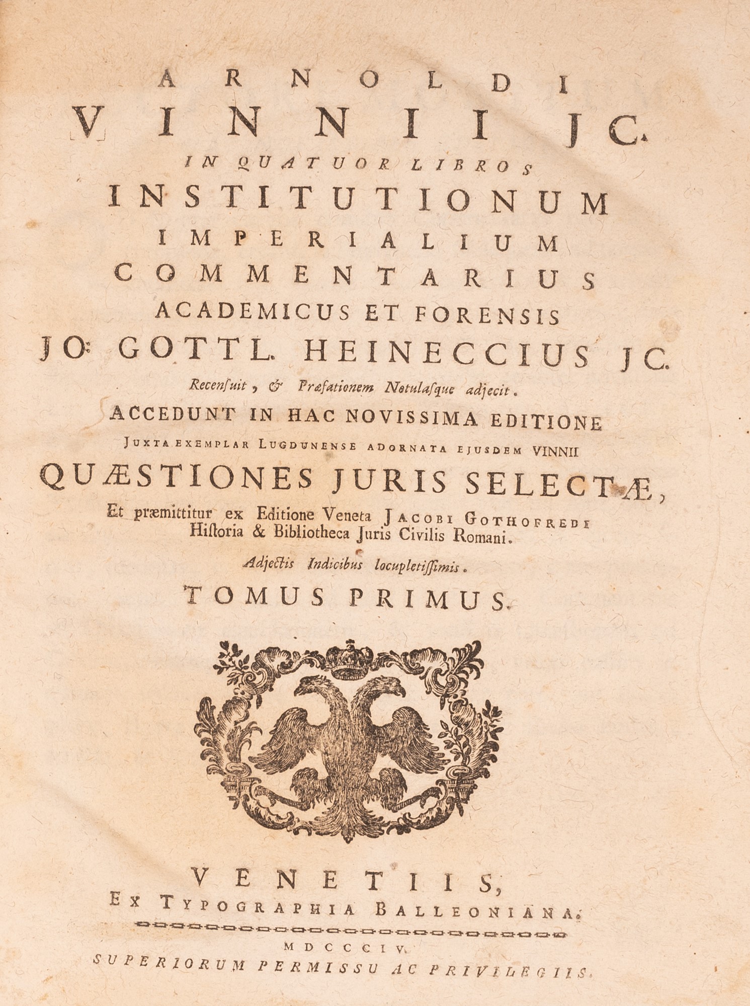 - Arnoldi Vinii in quatuor libros institutionum imperialium commetarius academicus et forensis ( Jo. Gottl. Heineccius J. C.)