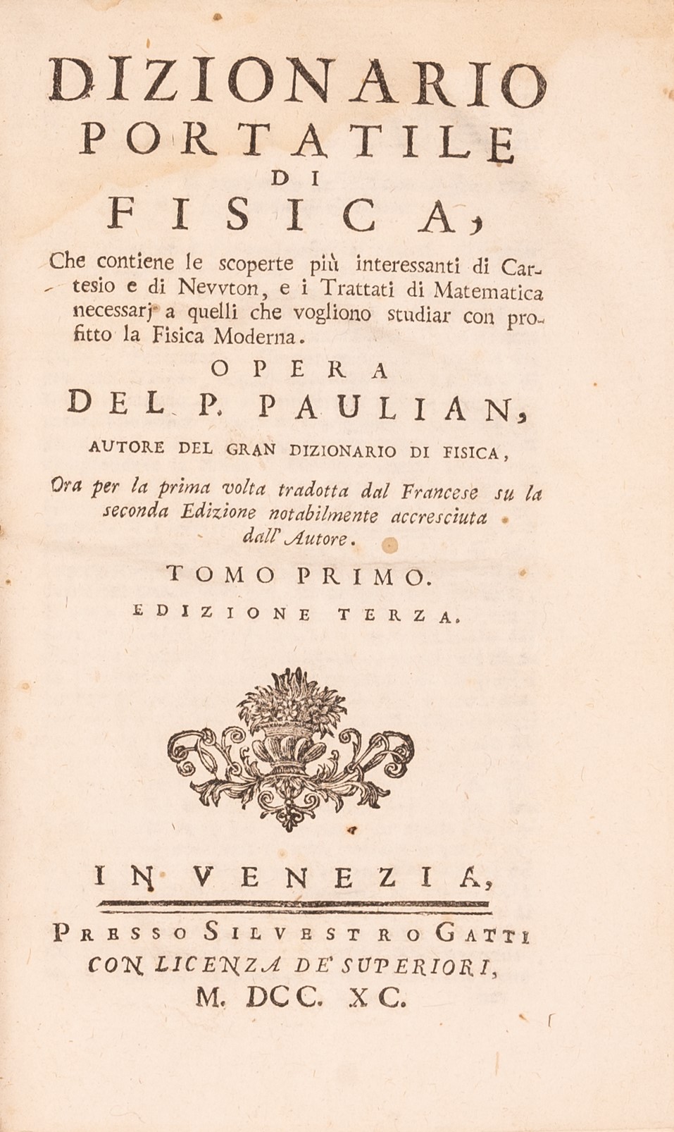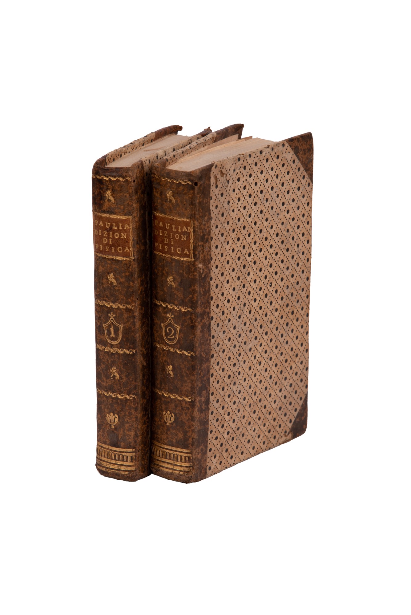 In 8. , in mezza pelle con rinforzi agli angoli dei piatti a motivi di losanghe. titoli e fregi in oro ai dorsi. Edizione del 1790 di questo dizionario portatile di fisica scritto da Aimè Henri Paulian (1722-1801). L'opera è composta da due tomi ed è completa. All'interno le scoperte più interessanti di Cartesio e Newton, trattati di matematica, astronomia, elettricità, fisica ecc...