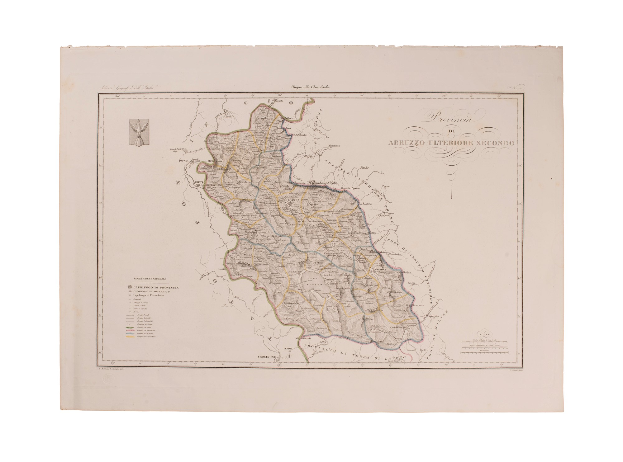 - Questa carta corografica dell'Abruzzo Ulteriore II, corrispondente ad un territorio un po' più ampio della Provincia dell'Aquila, è molto interessante anche per il dettaglio nel mostrare i centri minori; fu incisa e colorata per l'Atlante Corografico del Regno delle Due Sicilie tratto dalla Gran Carta d'Italia dedicato ad Adriano Balbi di Gabriello de Sanctis nella terza sua edizione di Napoli.