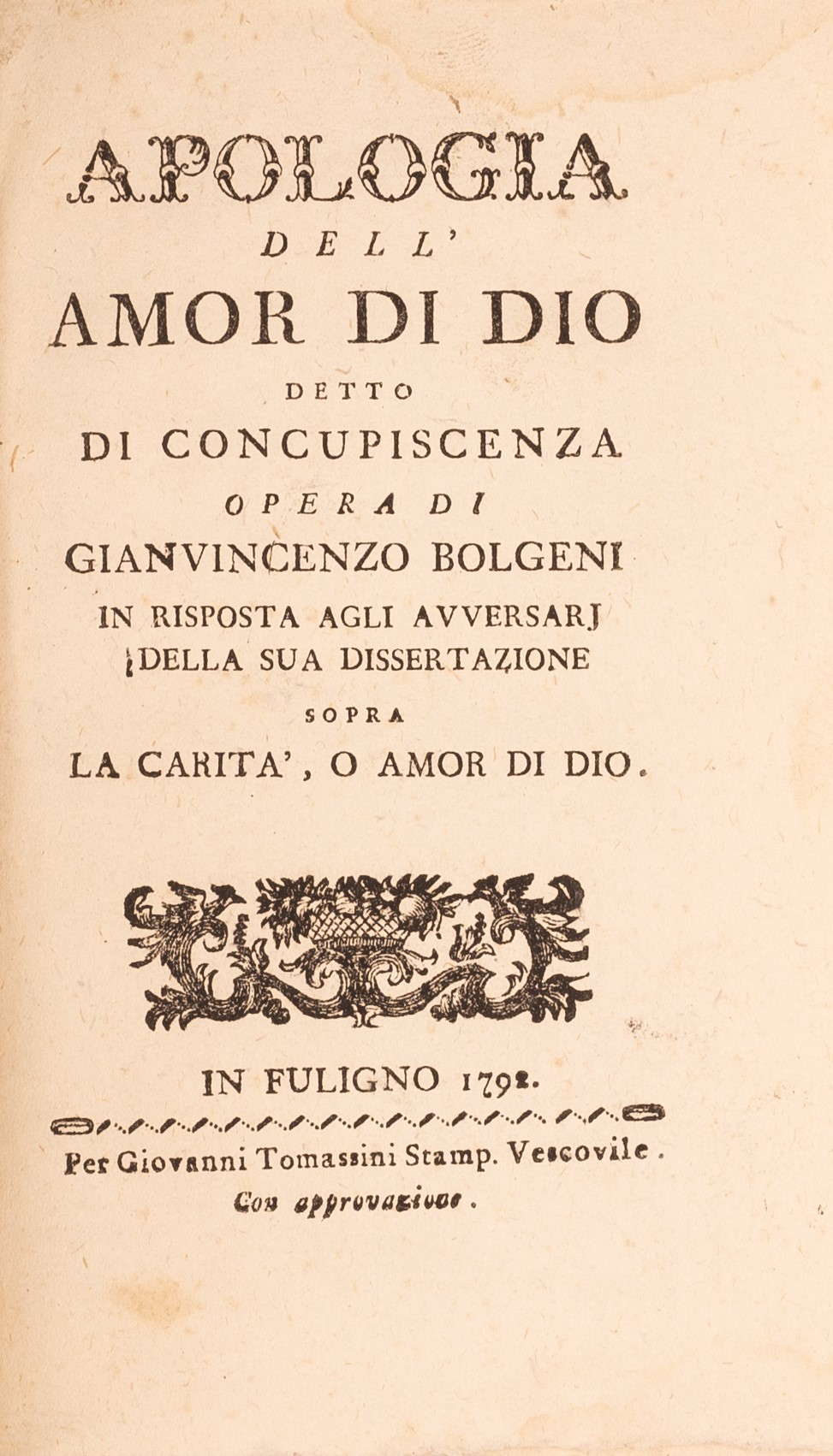 Apologia dell'amor di Dio detto concupiscenza. opera di Giambattista Bolgeni in risposta agli avversari della sua dissertazione sopra la carità o amor di Dio