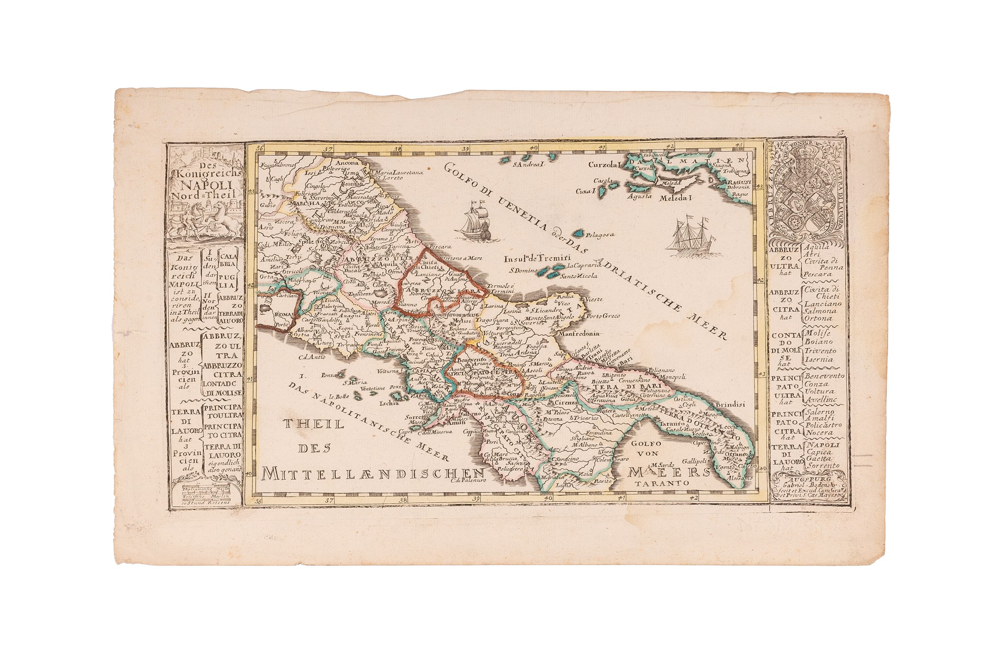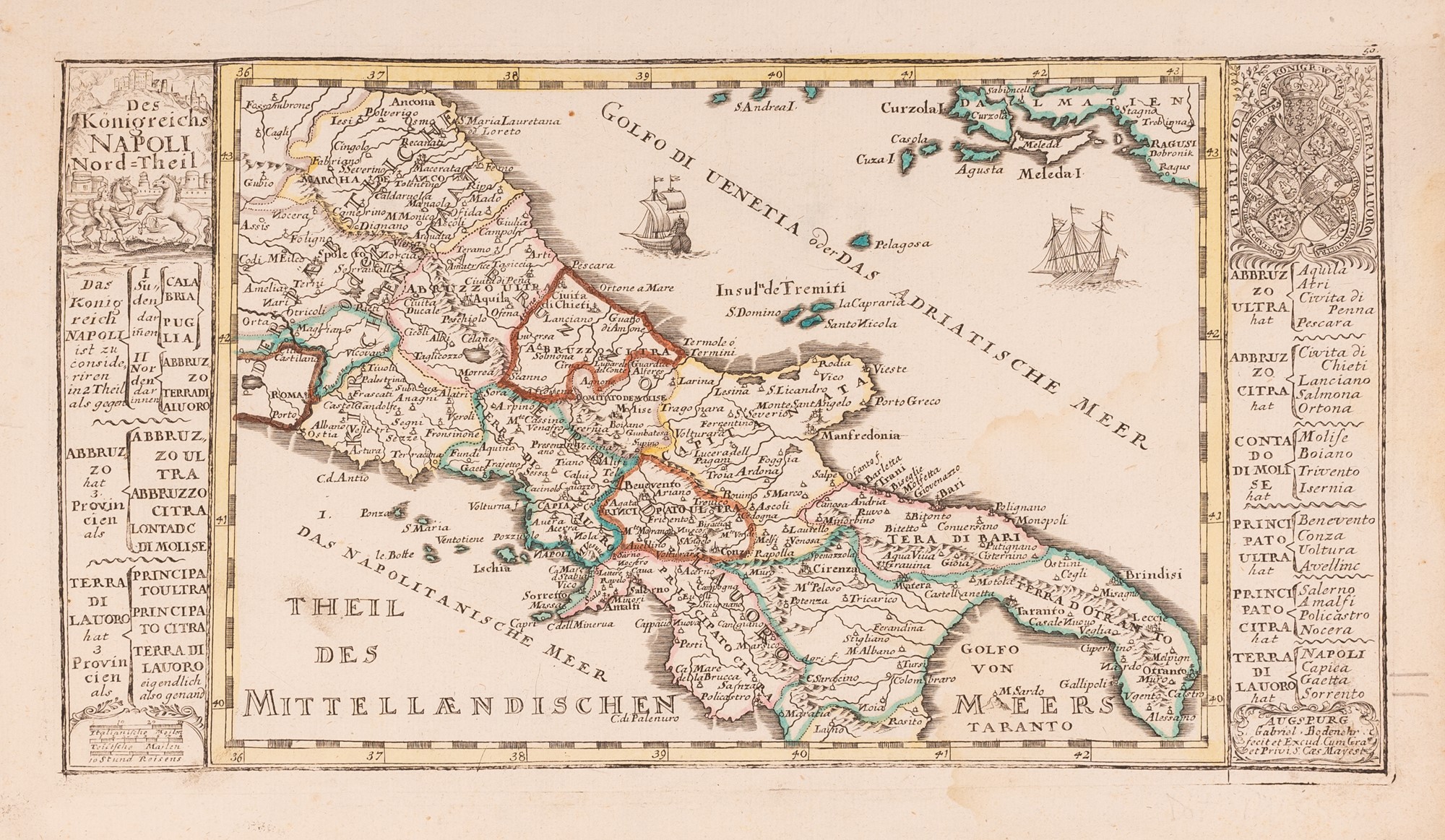 Carta geografica del Regno di Napoli inserita nell'opera "Curioses Staats und Kriegs Theatrum beeder konigreich Neapolis und Sicilien..." Gabriel Bodenehr kupfferstecher in Augspurg.