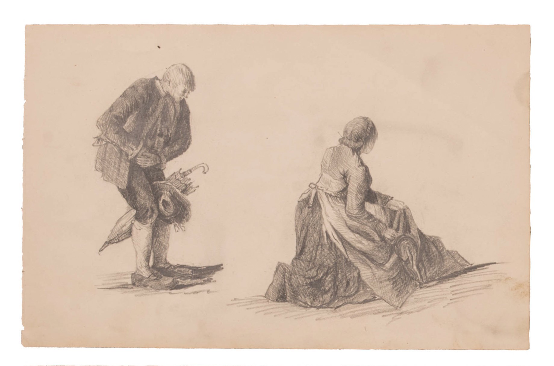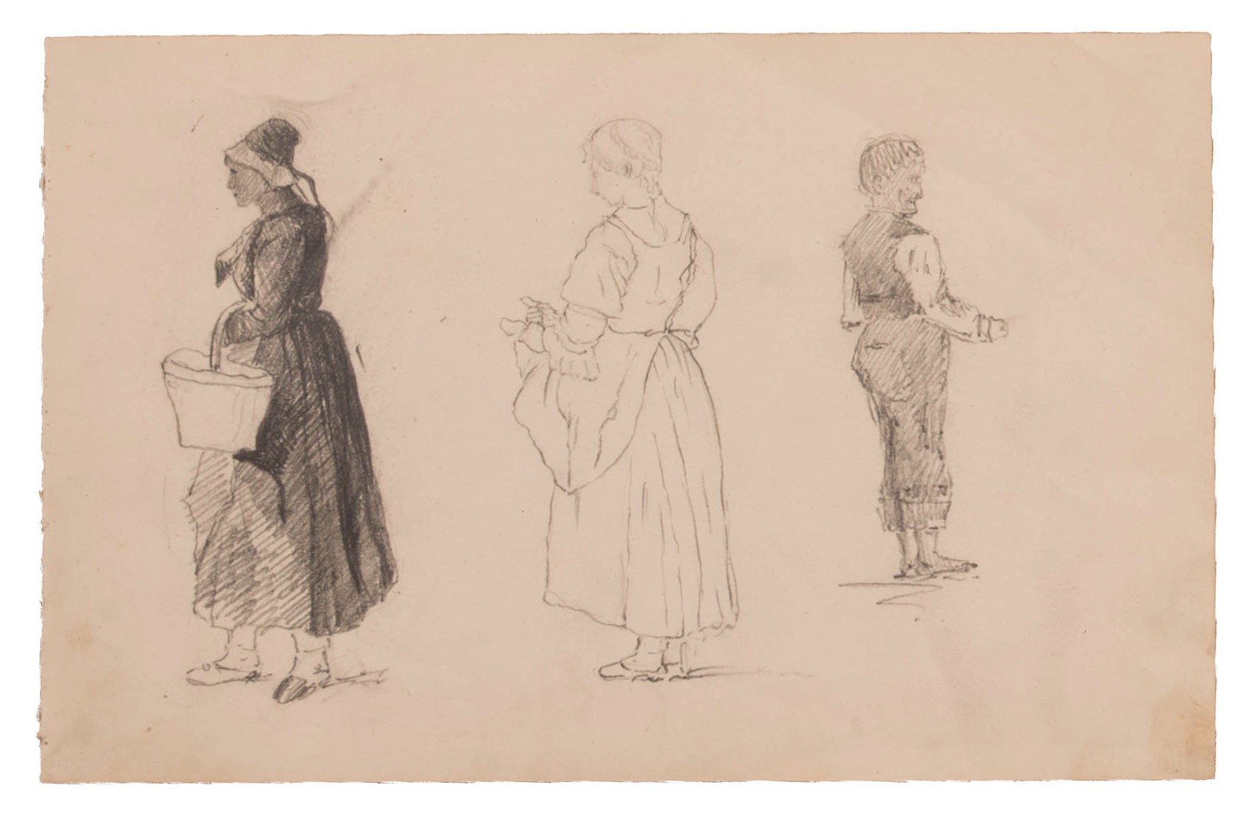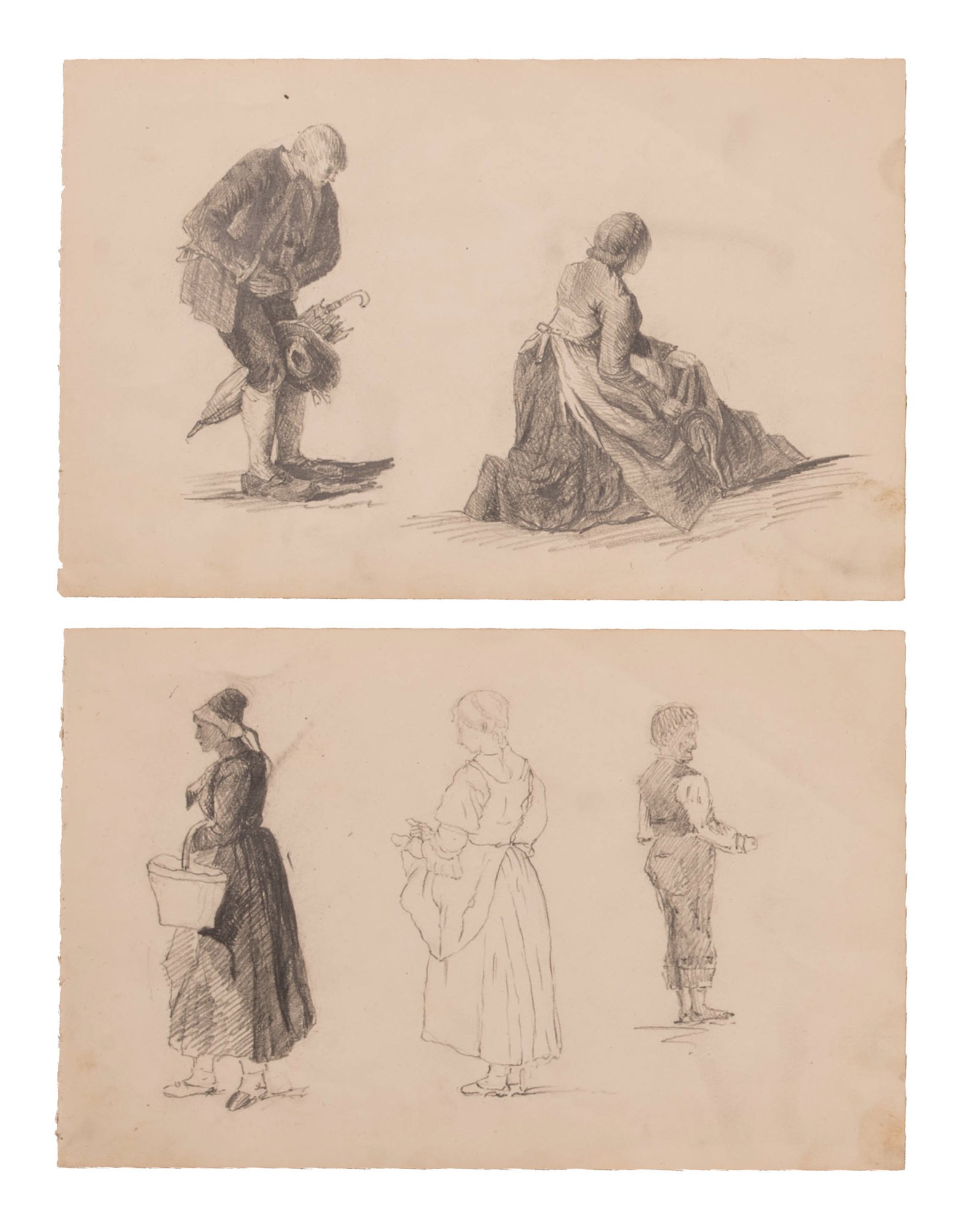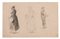 lotto di due fogli di disegni con uomini e donne in abiti popolani una disegnata anche al verso