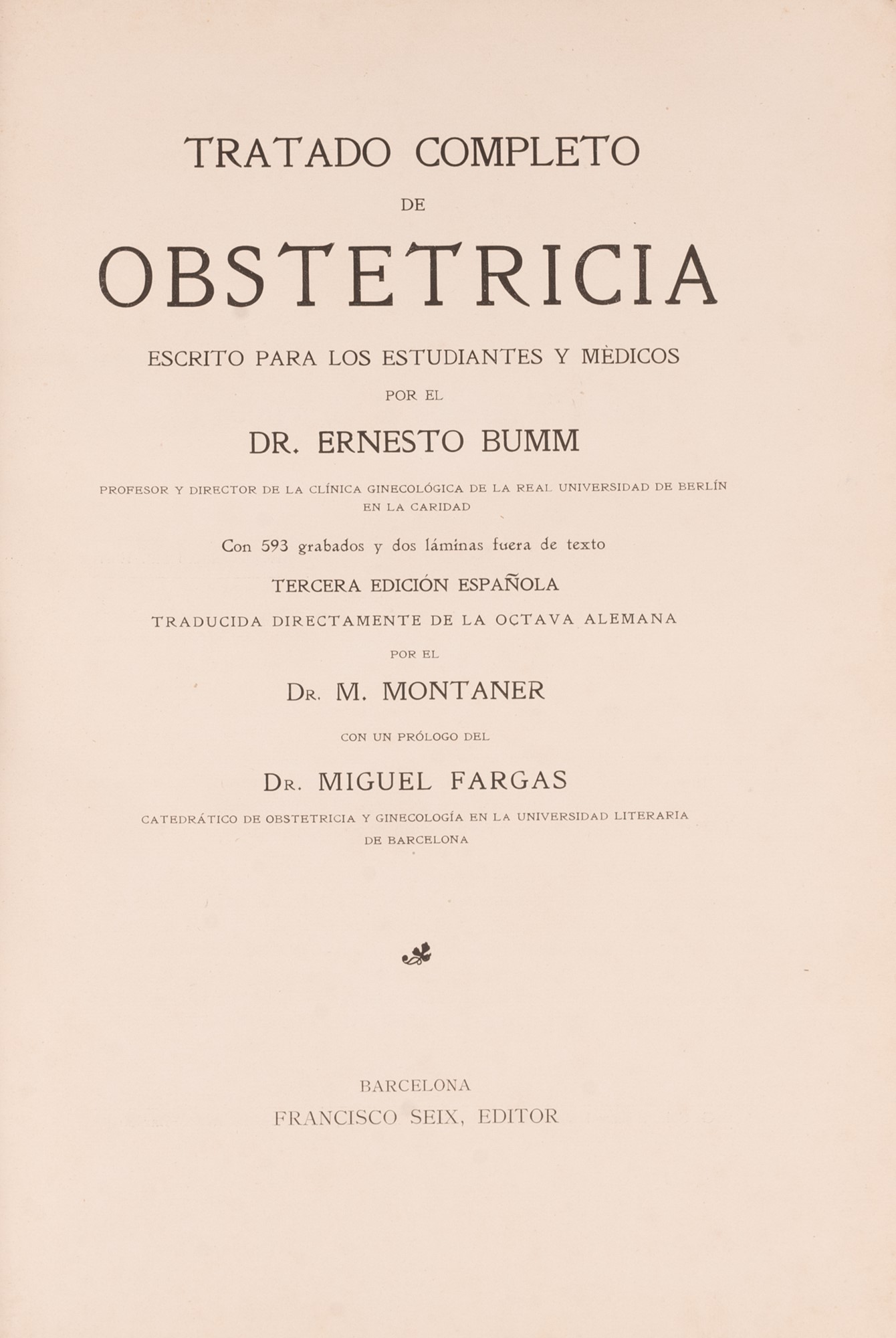 - Tratado completo de obstetricia escrito para los estudiantes y médicos / por Ernesto Bumm ; tercera edición española traducida directamente de la octava alemana por M. Montaner ; con un prólogo del Dr. Miguel Fargas
