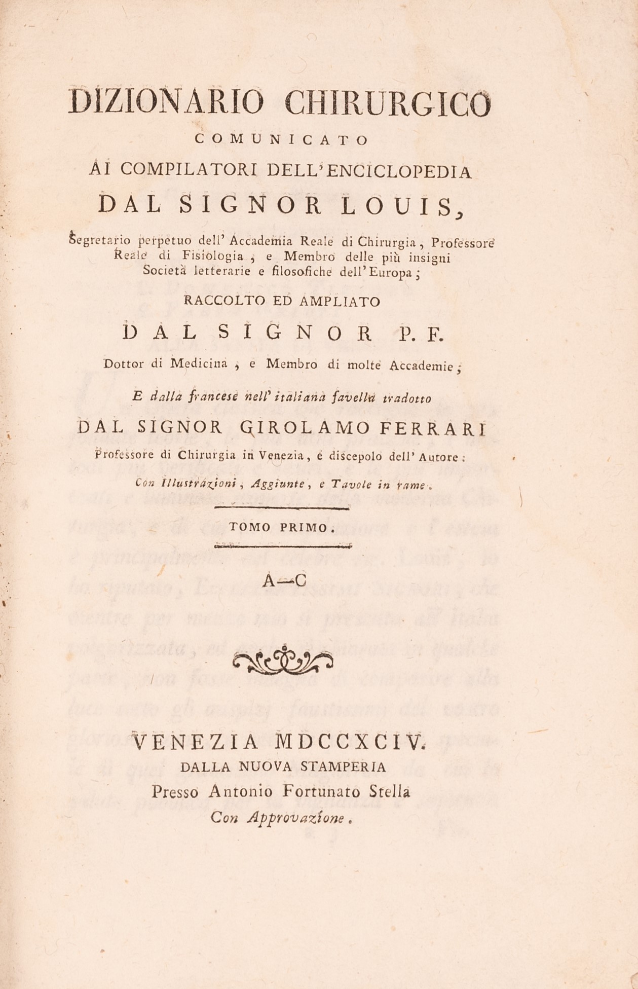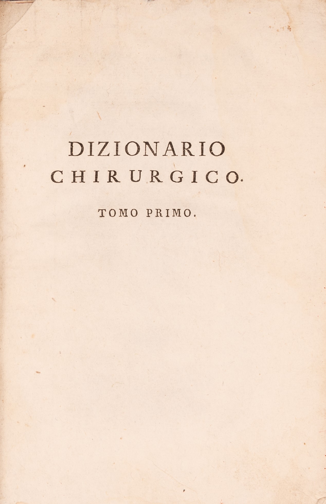 - Dizionario Chirurgico comunicato ai compilatori dell` enciclopedia dal Signor Louis, raccolto ed ampliato dal Signor P.F. Tomo Primo - Tomo Quarto. A - C; D - F; G - O; P - Z.