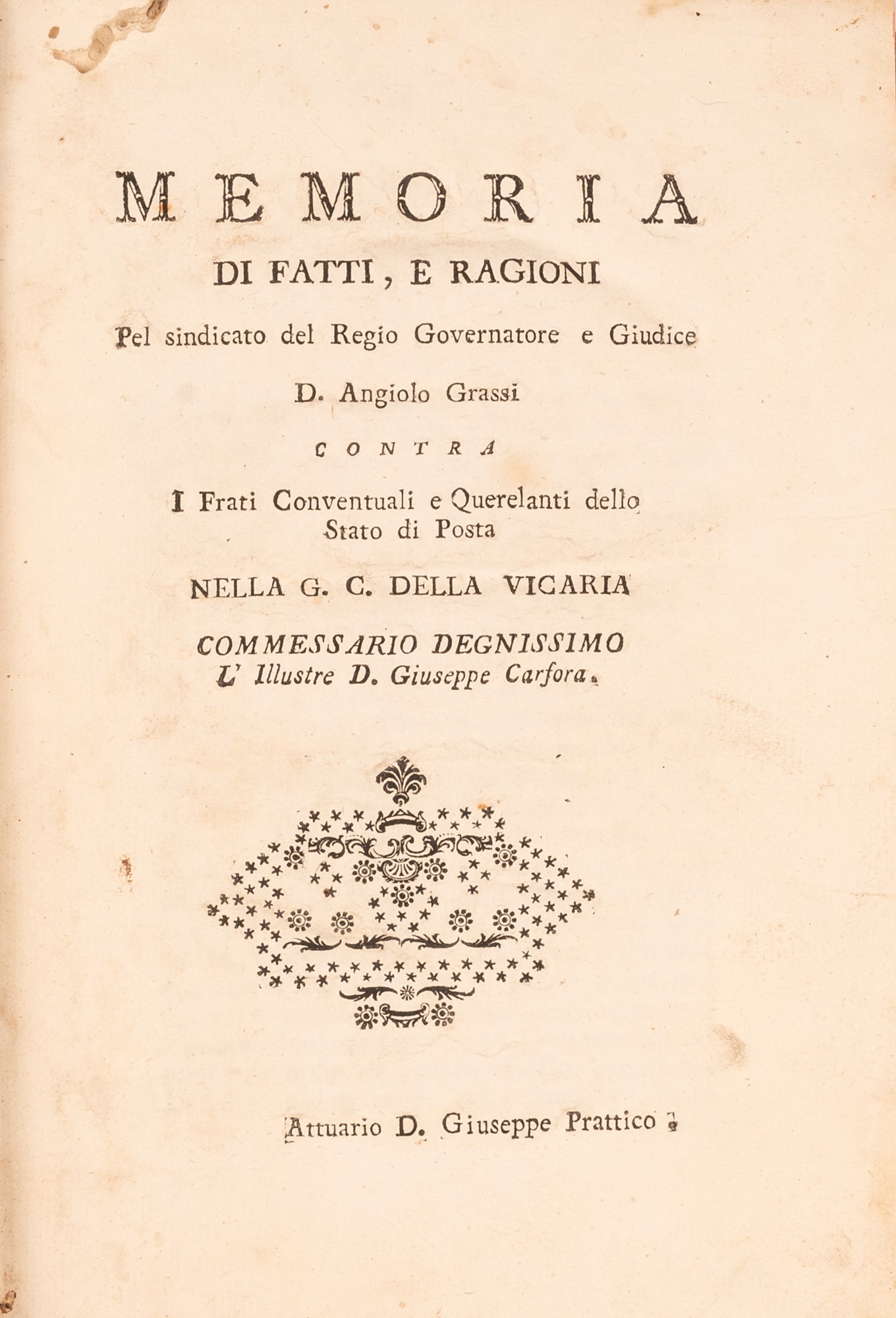 Memoria di Fatti e Ragioni del Sindacato del Regio Governatore e Giudice D. Angiolo Grassi contra i Frati Conventuali e querelanti dello Stato di Posta nella Gran Corte della Vicaria