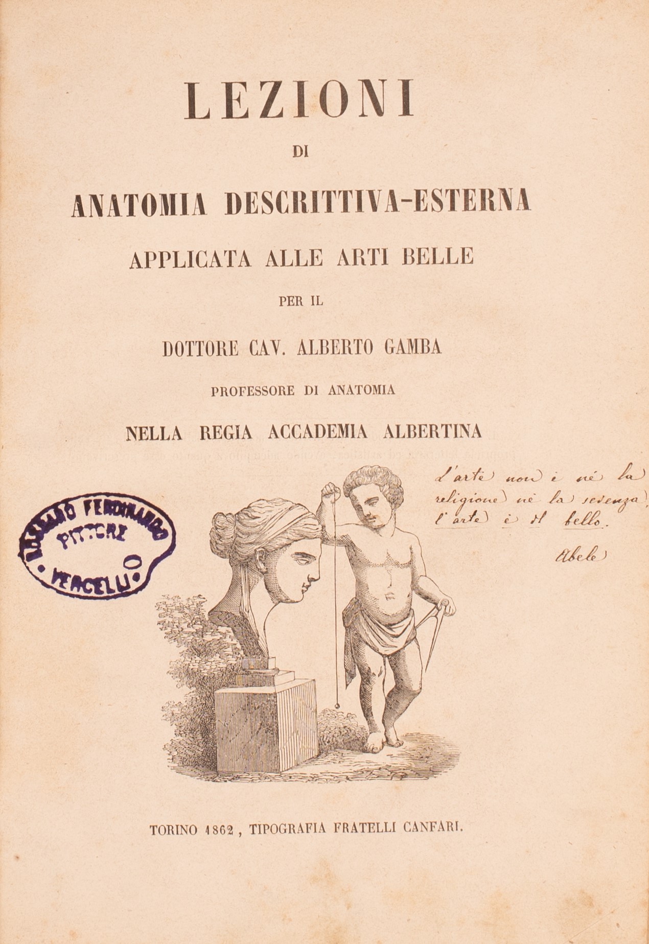 - Lezioni di anatomia descrittiva-esterna appicata alle Arti Belle ad uso degli Allievi per il dott. Cav. Alberto Gamba prof. Di anatomia nella Regia Accademia Albertina, TorinoTipografia Litografia Junck, Torino, 1862