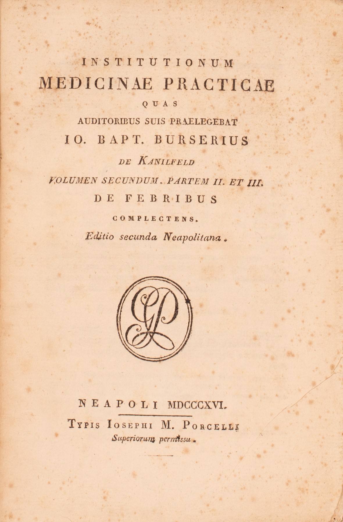 Titolo: Institutionum medicinae practicae quas auditoribus suis praelegebat Io. Bapt. Burserius de Kanilfeld, volumen primum (-octavum) ...EdizioneEditio secunda neapolitanaPubblicazioneNeapoli : typis Iosephi M. Porcelli, 1816-1817