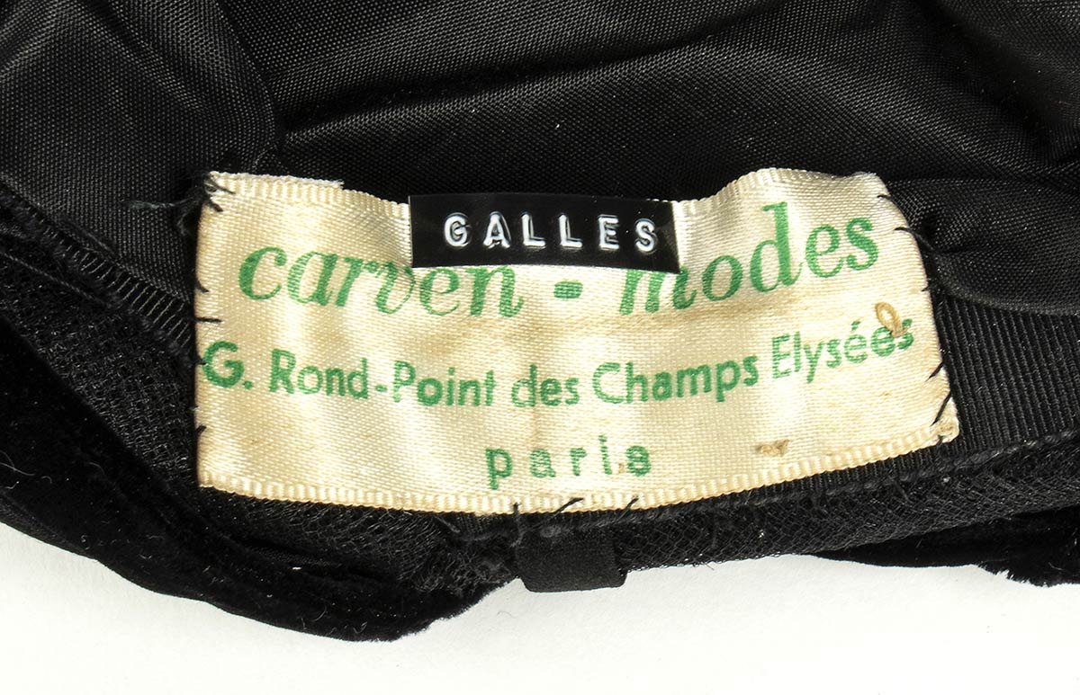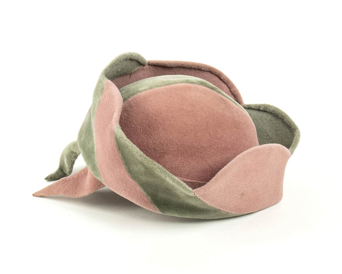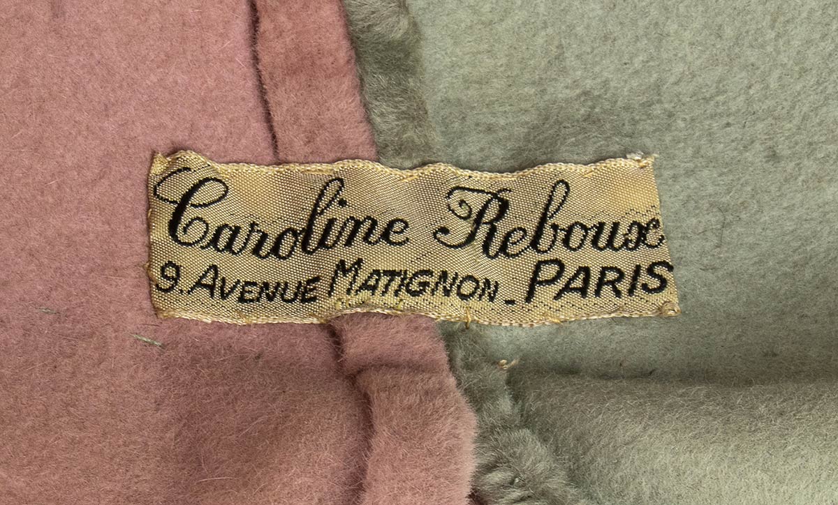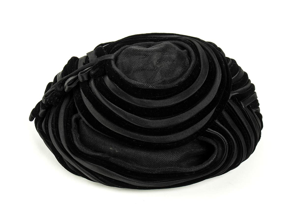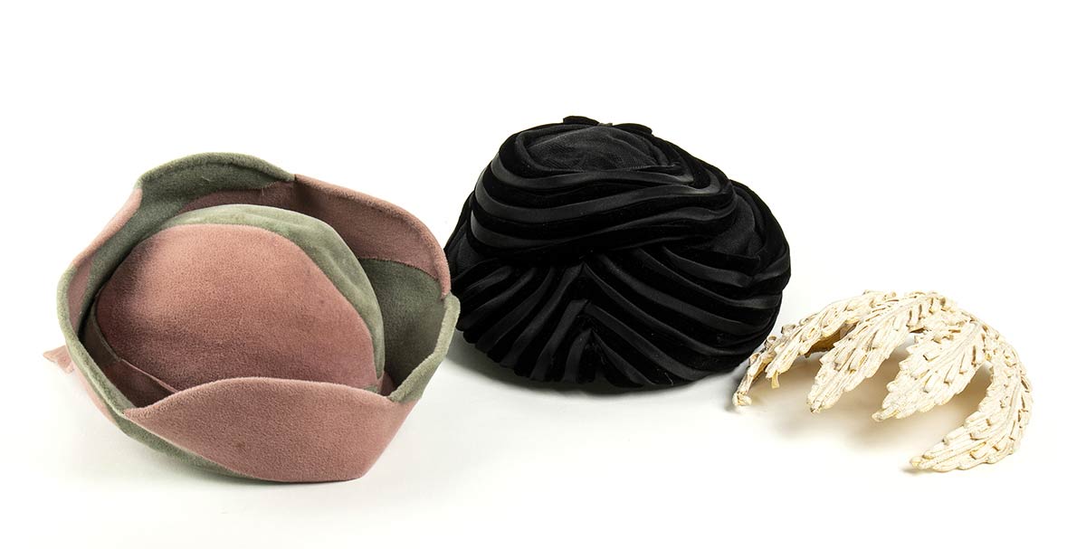 Lotto di 3 cappelli: cappello Caroline Reboux fine anni 30 in feltro di coniglio rosa e grigio, cappello Carven anni 50 in seta nera e velluto, acconciatura anni 50 realizzata con cordonetto avorio inamidato