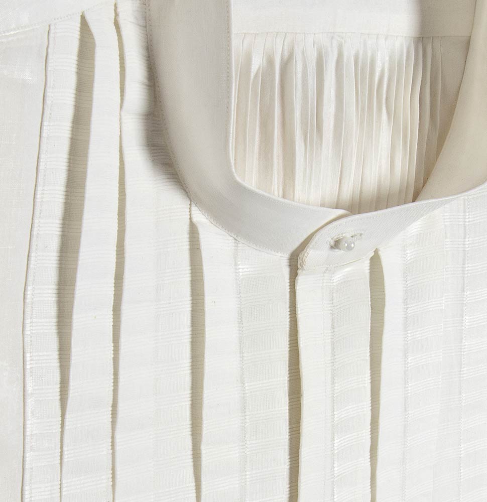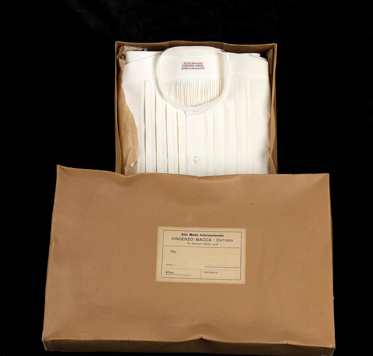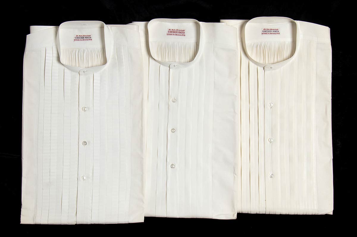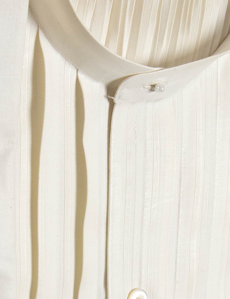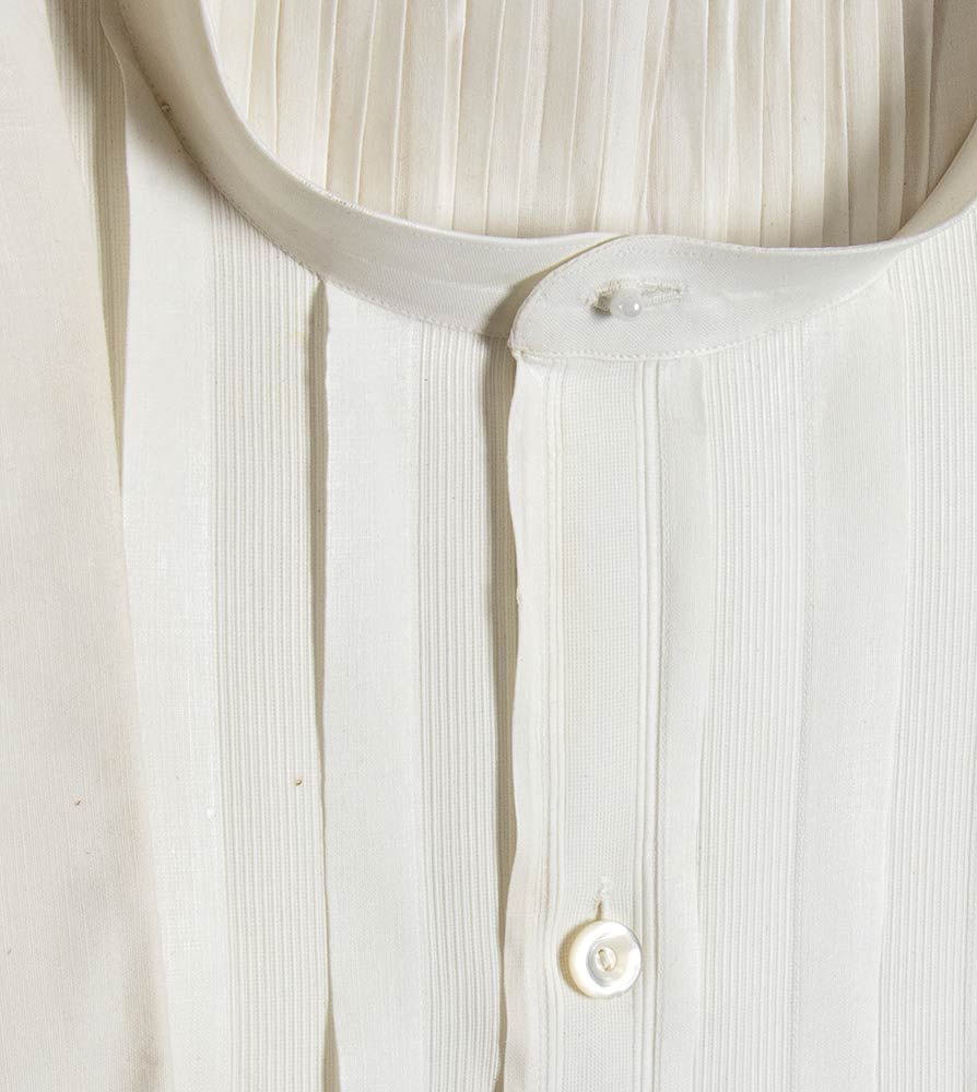 Lotto di 3 camicie bianche in cotone maschili anni 30/40 con sparato plissè, scatola originale, grado di condizione generale A/B