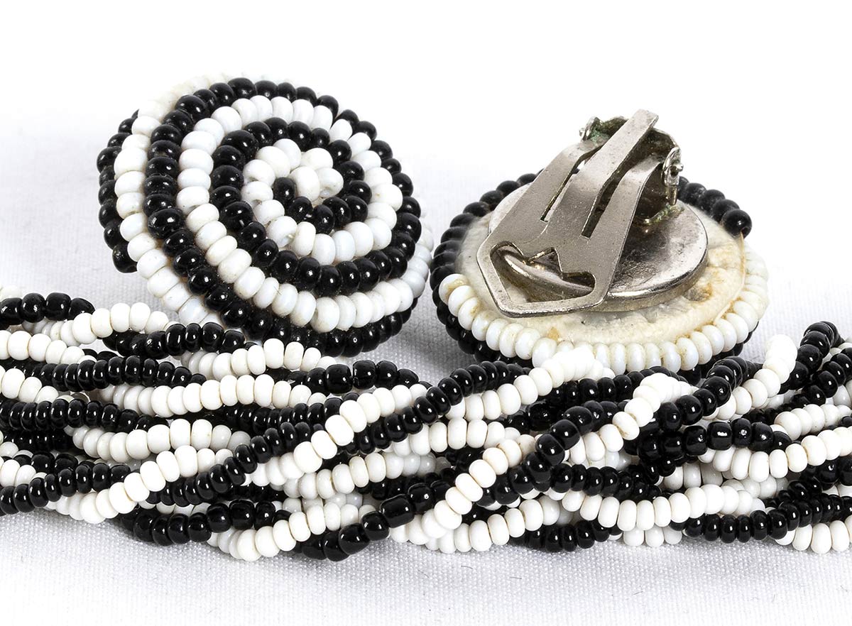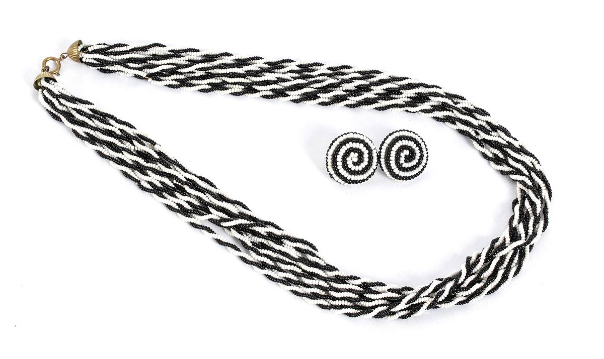 Set anni 50 composto da orecchini a clip e collana, perline bianche e nere, gardo di condizione generale B