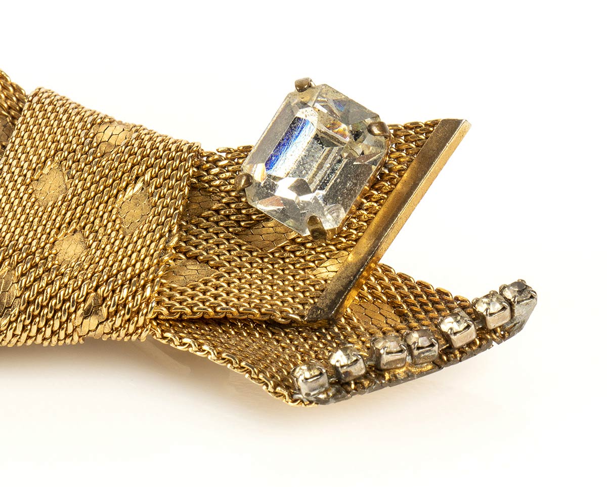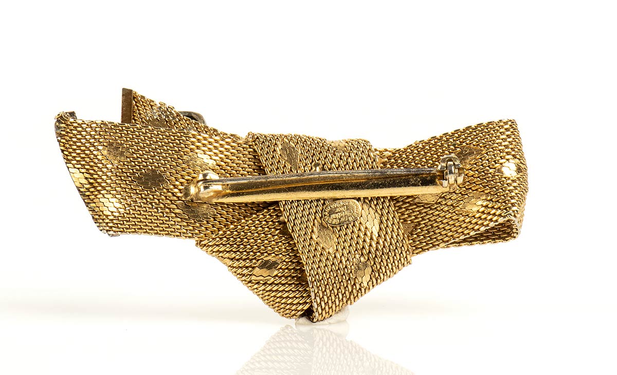 Spilla in metallo dorato a forma di nodo lavorazione a maglie pasta vitrea e strass