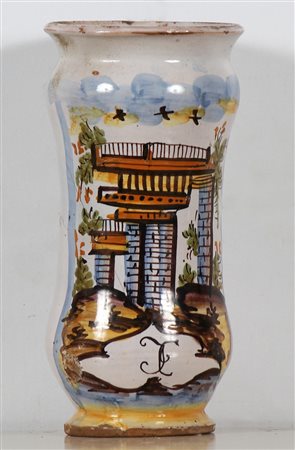 Ceramica albarello con decorazioni raffiguranti una casa ed uccelli....