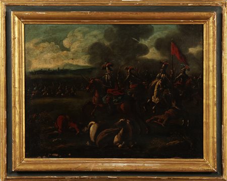 ANONIMO Battaglia. Olio su tela . Cm 64,00 x 50,00. Stile del XVIII secolo. Cornice presente