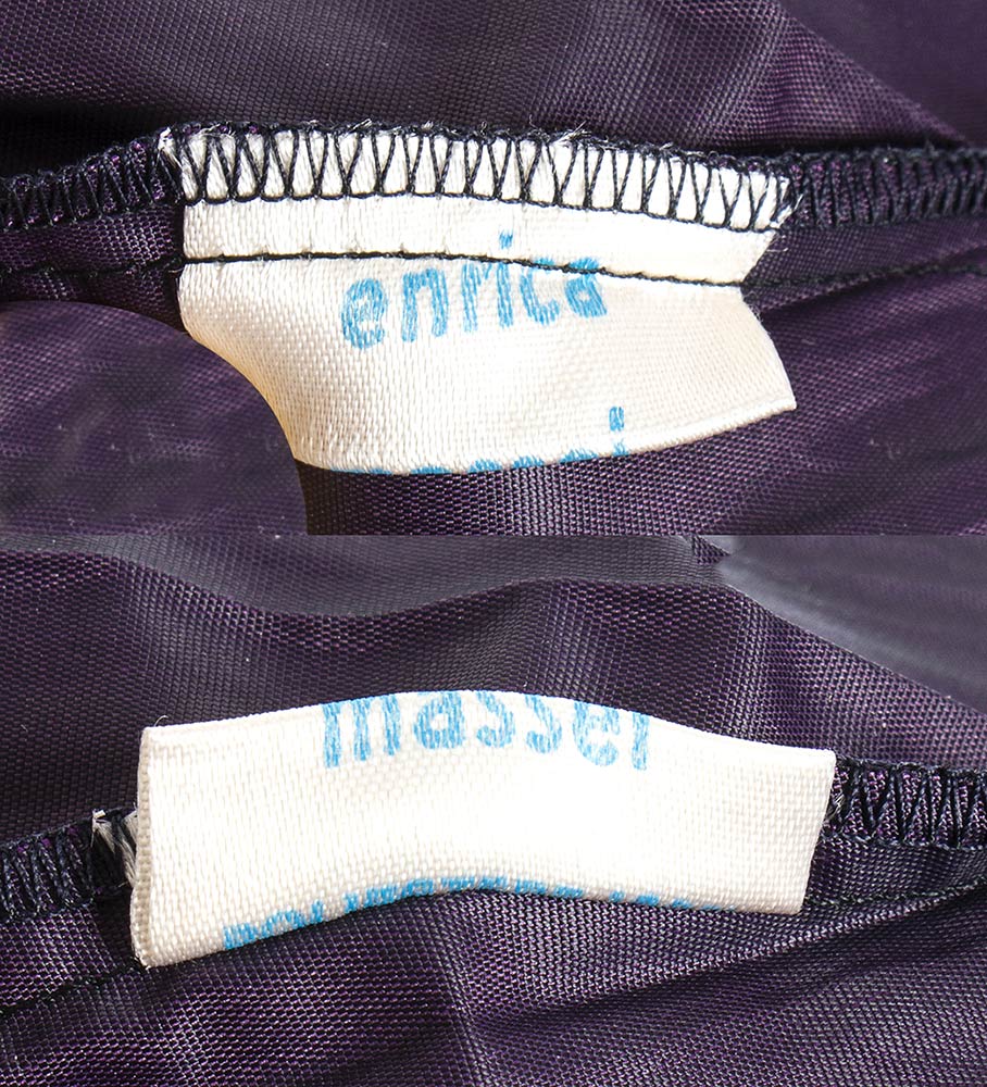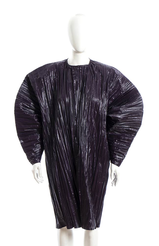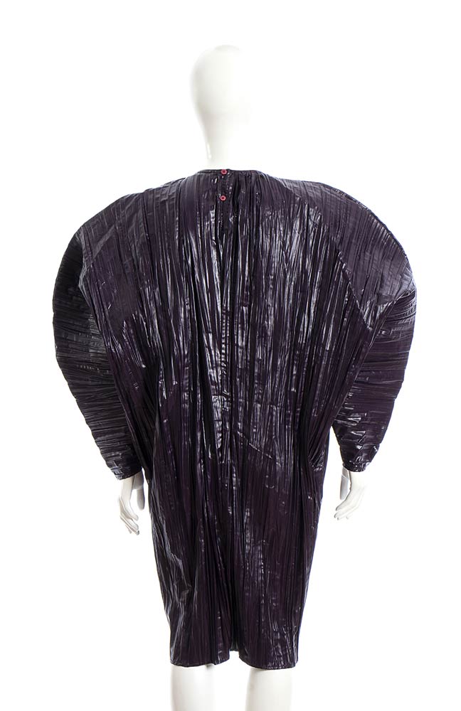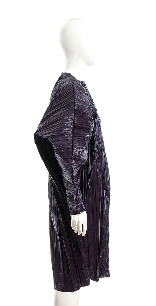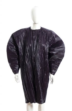 Abito Enrica Massei autunno/inverno 1981/82 in tessuto di poliestere plissettato viola scuro, grado di condizione generale B