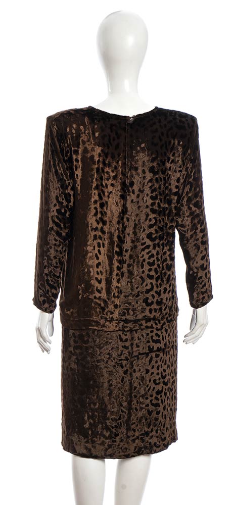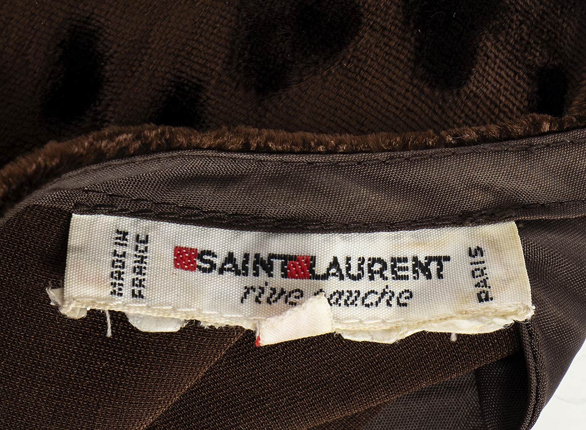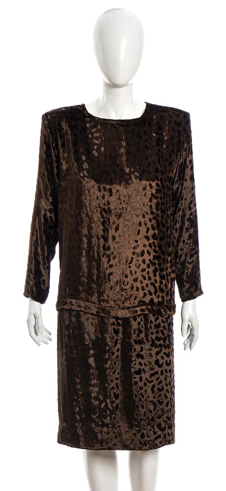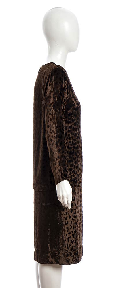 Completo (blusa e gonna) Saint Laurent Rive Gauche anni 80 in vellutomarrone lavorazione devoré, grado di condizione generale B