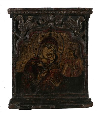 MAESTRO VENETO CRETESE Madonna e bambino. Tempera su tavola. Cm 29,00 x 34,50 x 3,50.