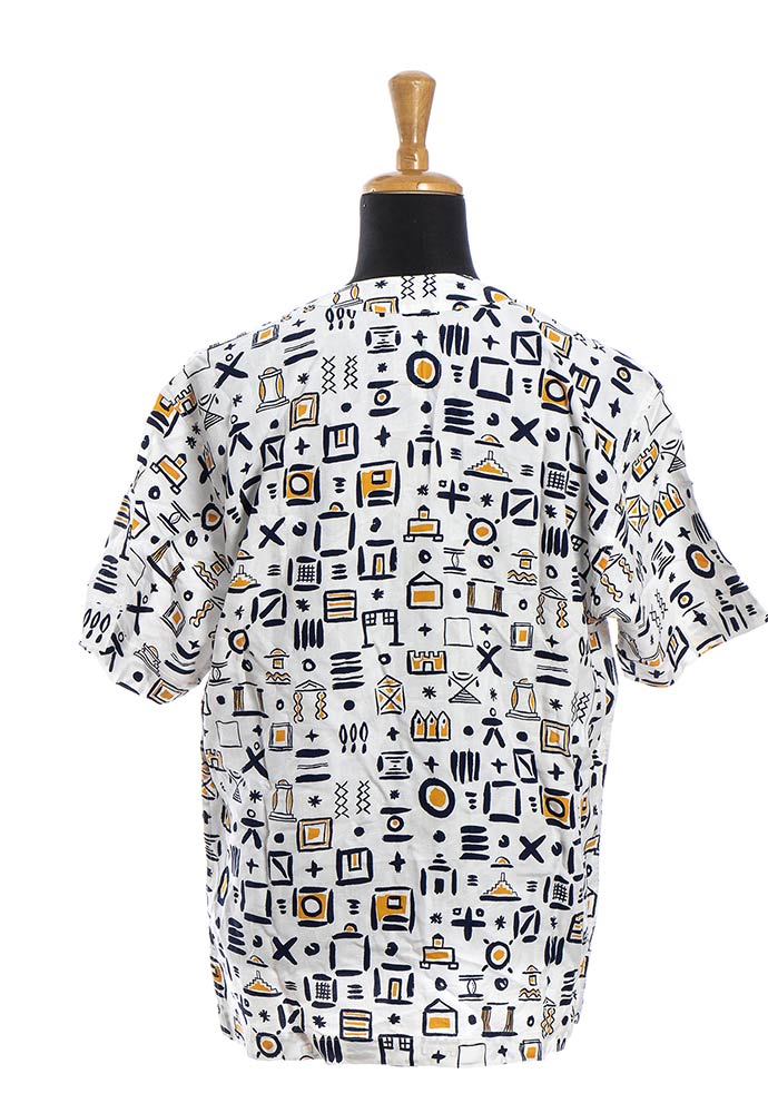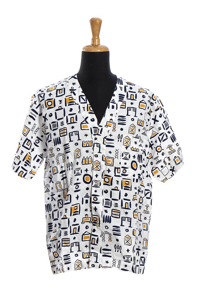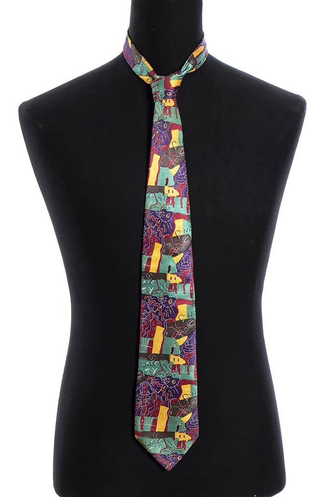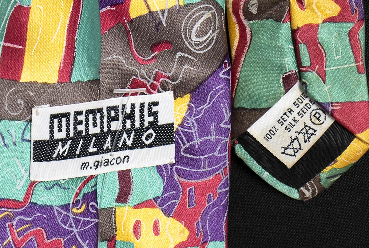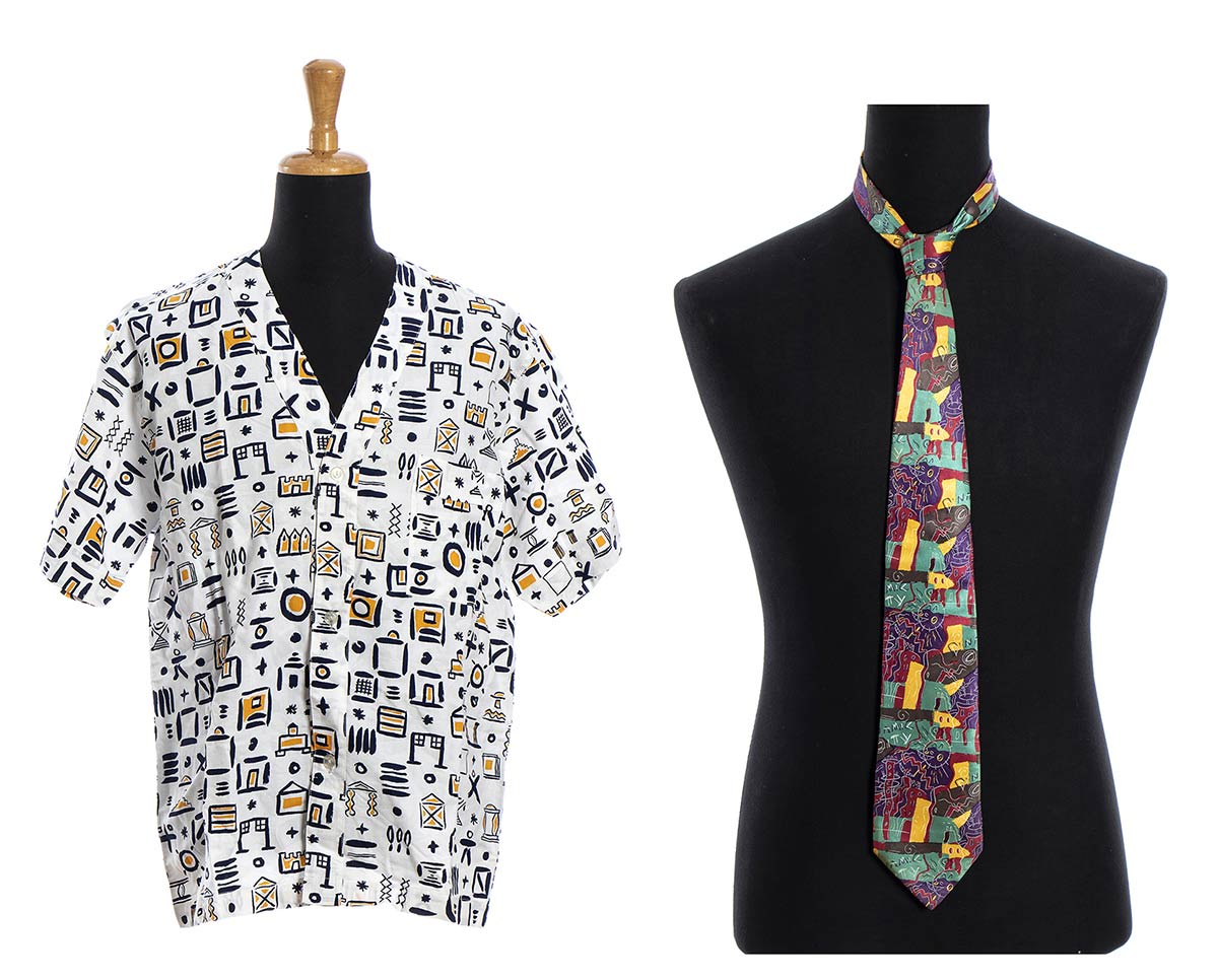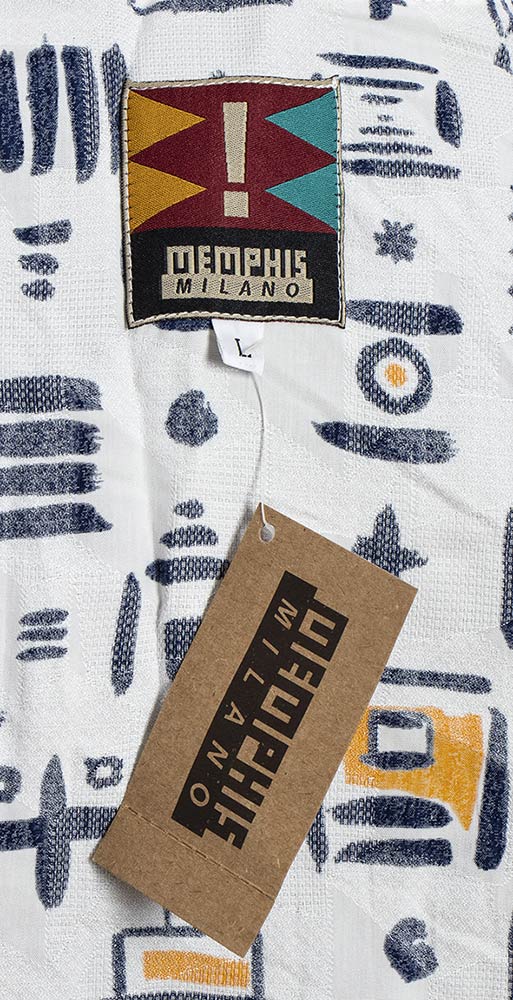 Lotto di 2 articoli anni 80 Memphis: camicia in cotone e cravatta in seta (by Massimo Giacon), grado di condizione generale A (camicia), B (cravatta)