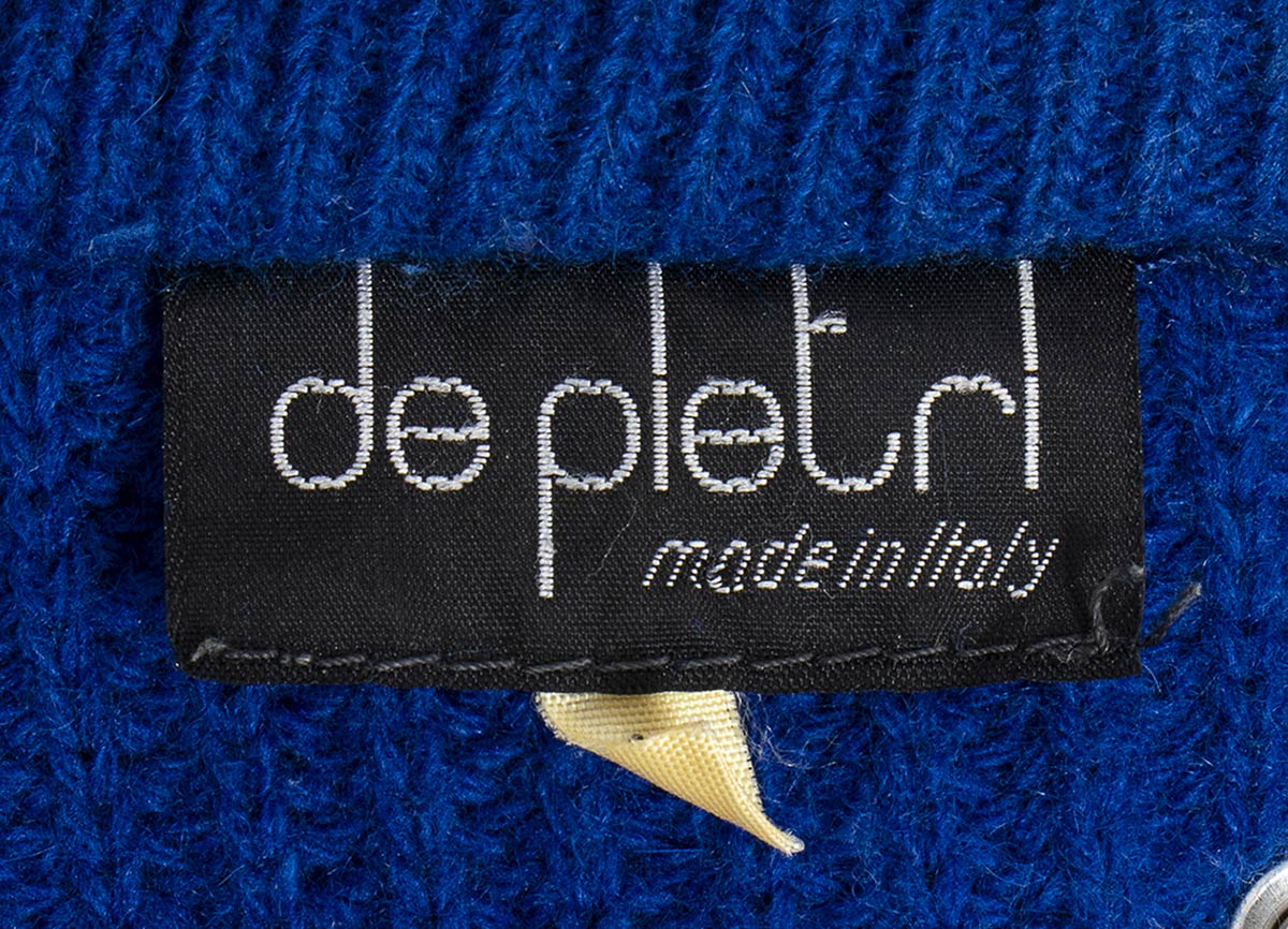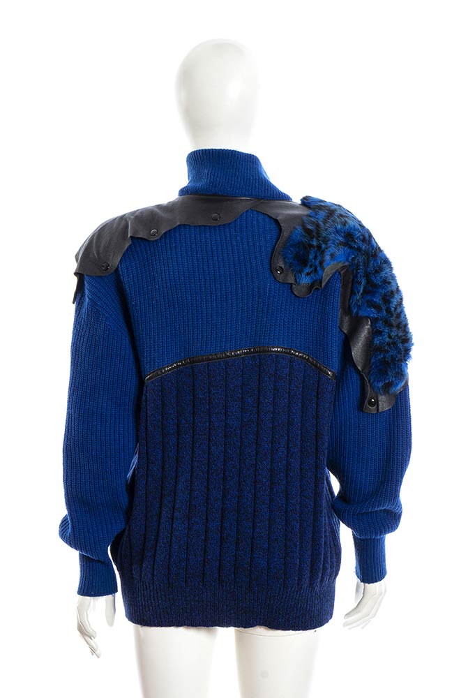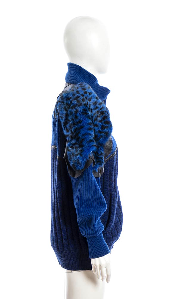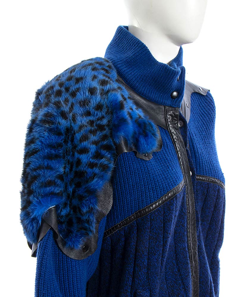 Cardigan inizio anni 80 De Pietri in lana bluette dettagli in finta pelliccia e similpelle, grado di condizione generale B