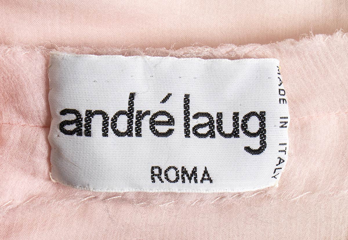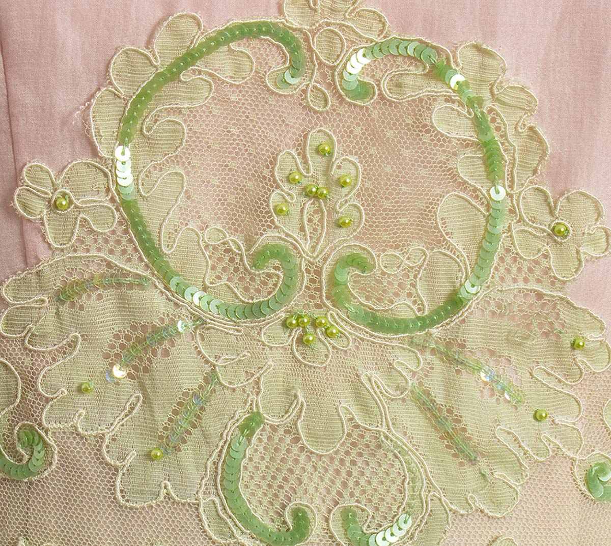 Abito Andrè Laug 1983 ca in seta rosa chiaro dettaglio in pizzo con ricamo di paillettes e perline, grado di condizione generale B