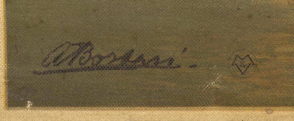 Ritratto del Duce a cavallo, oleografia su tela di un'opera originale realizzata da Borsari nel periodo 1922-1927. Benito Mussolini, duce del fascismo, raffigurato in alta uniforme. Tipologia della giacca, delle spalline, e del fez morbido identificabili nel regolamento del 1923. Firmato in basso a sinistra ABorsari, seguita dal simbolo dello studio grafico. Oleografia originale stampata durante gli anni '20 del XIX secolo, in ottime condizioni. Misure cm.51x78