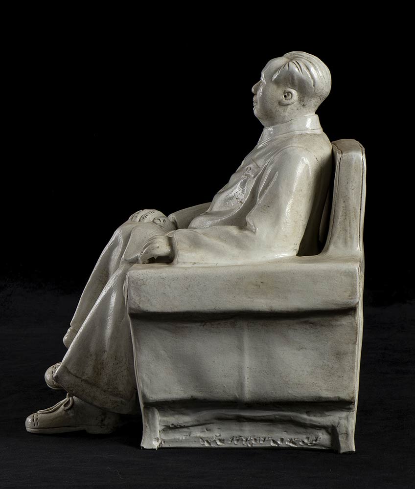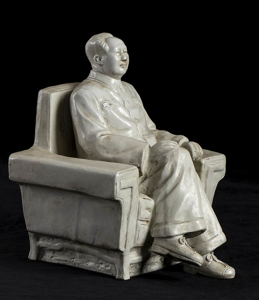Mao, presidente del partito comunista cinese, seduto in poltrona. Realizzata in ceramica bianca, probabilmente negli anni '50 , raffigura Mao in tipico abito elegante cinese, dal volto sorridente e rassicurante come da canoni della propaganda comunista. Stampigliato alla base con ideogramma cinese e numero 002. In perfette condizioni, necessita di una pulitura da polvere, misura circa cm. 25x22x20