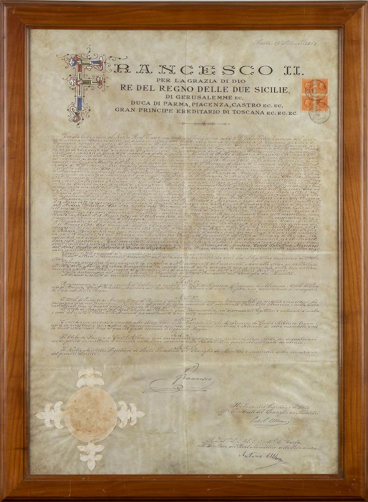 Attestato su carta pergamena, vergato e miniato a mano, datato 26 Settembre 1860, dettato da FRANCESCO II Re del Regno delle Due Sicilie, con il quale si concedono a Don Felice Vito Amoroso i titoli nobiliari di Principe di Amorio, Duca di Rijeka, Conte Palatino, Marchese del Real Soglio di Polonia, trasmissibili ai suoi discendenti legittimi e naturali. Attestato firmato autografo dal re FRANCESCO II, con applicato all'angolo sinistro il sigillo reale in carta velina. Controfirmato autografo, in basso a destra, dal Presidente del Consiglio dei Ministri PIETRO CALA' ULLOA e dal fratello ANTONIO ULLOA in qualità di Direttore del Real Ministero della Presidenza. Ottime condizioni, piega centrale ed altre due pieghe orizzontali non deturpanti l'attestato, misure circa cm. 43x61 , all'interno di una cornice di cm.51x69.