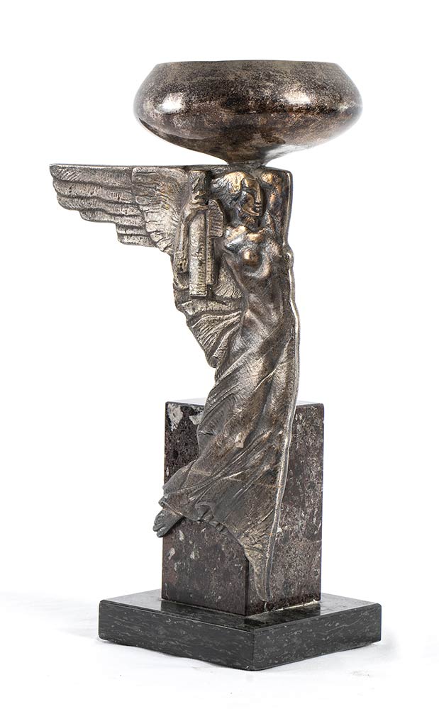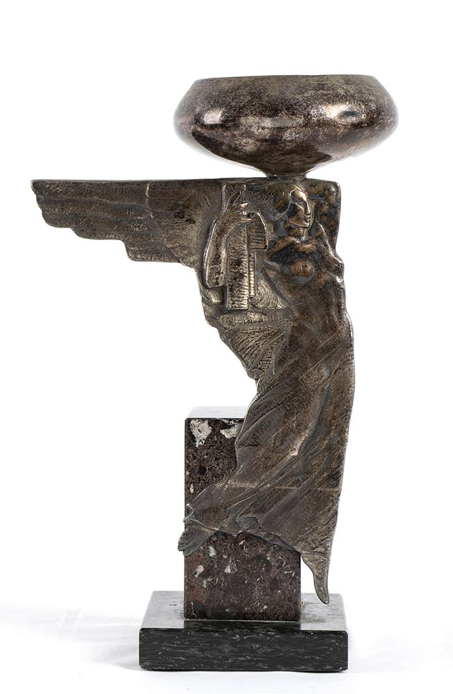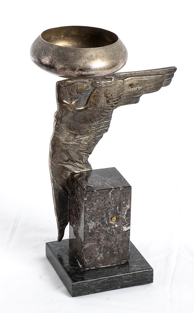 Trofeo in metallo autarchico argentato, che raffigura una vittoria alata con in braccio il fascio littorio, a seno scoperto. Tipica rappresentazione in stile fascista, alla maniera di Mario Sironi. La figura è piatta, lavorata su entrambe le facce e fissata ad una base in marmo, con in cima la coppa . In ottime condizioni, originale del periodo 1930-1944, misura circa cm. 34x22, la base in marmo circa cm. 12x12
