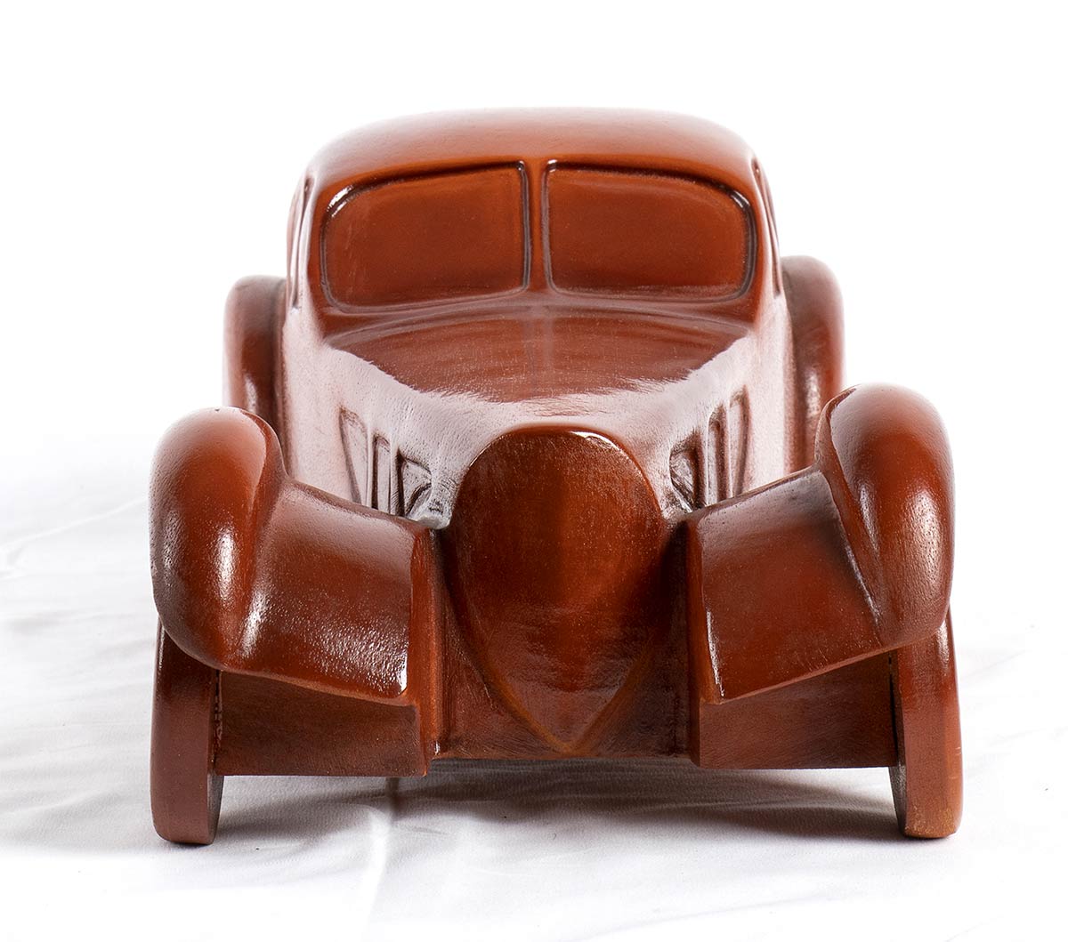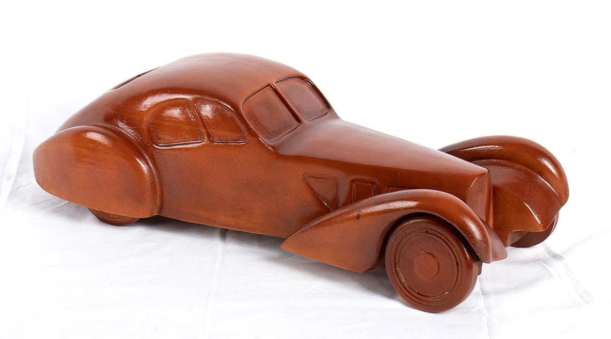 Modello in legno della futuristica e meravigliosa autovettura BUGATTI ATLANTIC , del 1936, la prima supercar della storia. Il modello era un promozionale per il rilancio della Bugatti, nell'era Artioli. Eccezionale lavorazione, scultura di enorme impatto e grande presenza, misura cm.54x21. In perfette condizioni.