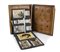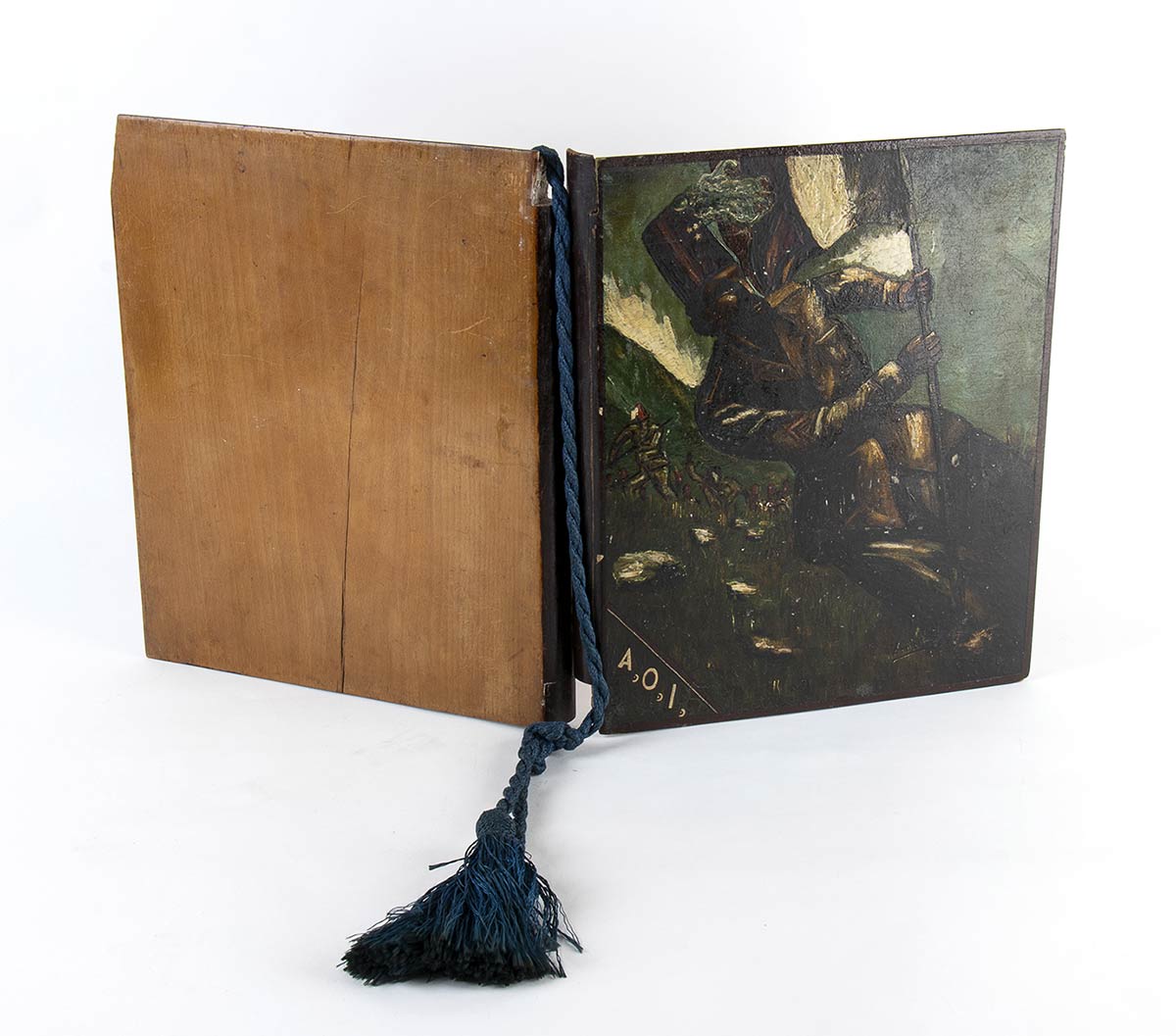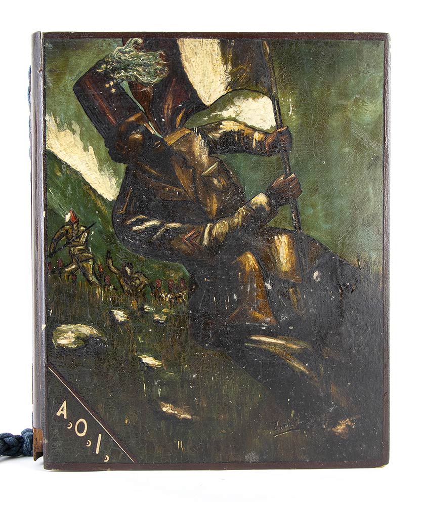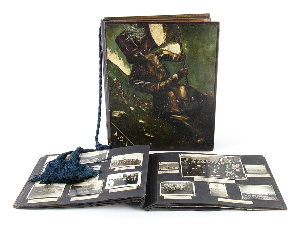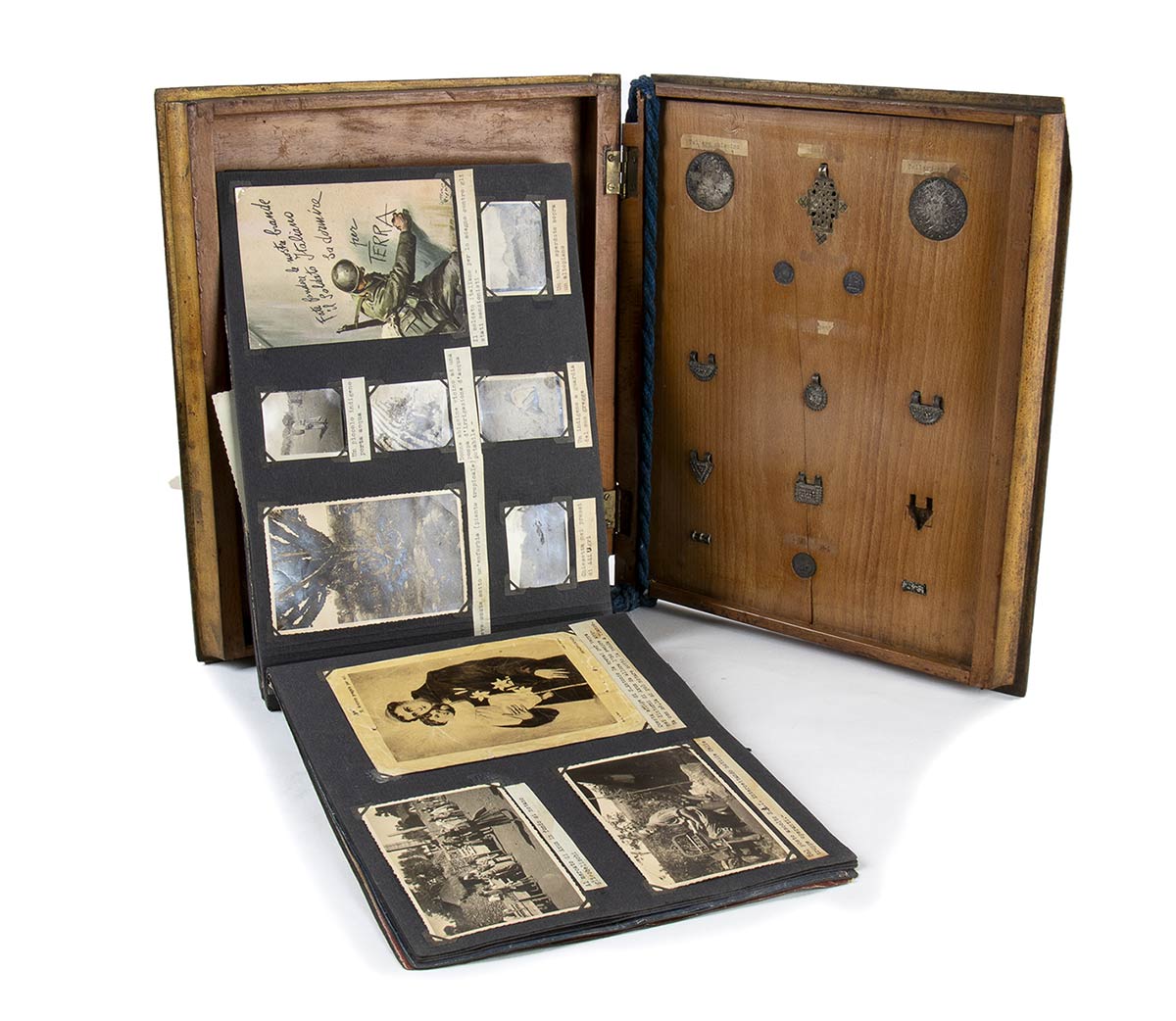 Contenitore in legno a forma di libro, in copertina un soldato Ascari in battaglia durante la campagna in Africa Orientale Italiana, sventolante il tricolore italiano. Dipinto a mano, olio su legno, firmato in basso a destra (Zarletti ?) . All'interno della scatola-libro troviamo un album che raccoglie più di 50 foto private e cartoline inclusa anche una cartolina di rame per il Comitato dei Mille - Ney York, ritagli di giornale dell'epopea africana, medaglia 225' reggimento di fanteria DIAVOLI e medaglia Divisione Gran Sasso, ed incastonate nel legno tredici tra reliquie religiose copte, monete e monili africani in argento. Bell'insieme particolare e raro. Dimensioni della scatola circa cm. 33x39. In buone condizioni.