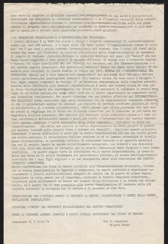 Il secondo comunicato delle Brigate Rosse dopo il rapimento di Aldo Moro, viene redatto il 25 Marzo 1978 , stampato e distribuito dalle varie cellule rivoluzionarie nelle città italiane. Si fa un'analisi dell'operato dell'onorevole Moro e sulle sue tappe politiche nel periodo 1955-1978, concludendo che è con i criteri della GIUSTIZIA PROLETARIA che egli verrà giudicato. In seconda pagina si affronta il tema sul TERRORISMO IMPERIALISTAE L'INTERNAZIONALISMO PROLETARIO, chiudendo poi con il ricordo ai compagni Lorenzo Jannucci e Fausto Tinelli assassinati pochi giorni prima a Milano. Volantino in ciclostile originale dell'epoca, su carta di media grammatura, presenta l'intestazione BRIGATE ROSSE con la stella a cinque punte cerchiata, ed è stampato su due facciate (fronte e retro).