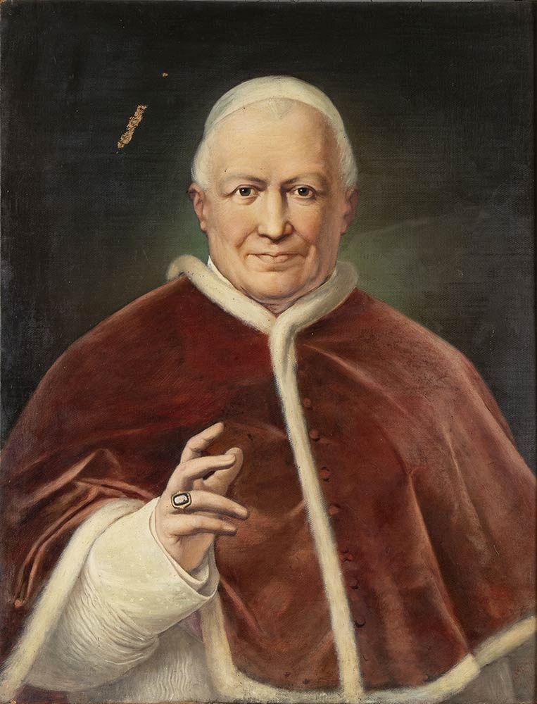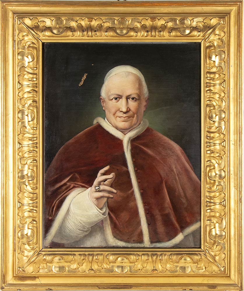 Ritratto di Papa PIO IX, nato Giovanni Maria Mastai Ferretti. Benedicente, in abito corale con mozzetta di velluto rosso ed ermellino, con in testa lo zucchetto bianco, alla mano l'anello piscatorio. Olio su tela, firmato in basso a destra S.PETACCO 187(?), con cornice di legno dorato. In buone condizioni, lieve danno alla tela con mancanza di colore in alto a sinistra, facilmente restaurabile. Misure della tela cm.59x78, della cornice cm.91x112