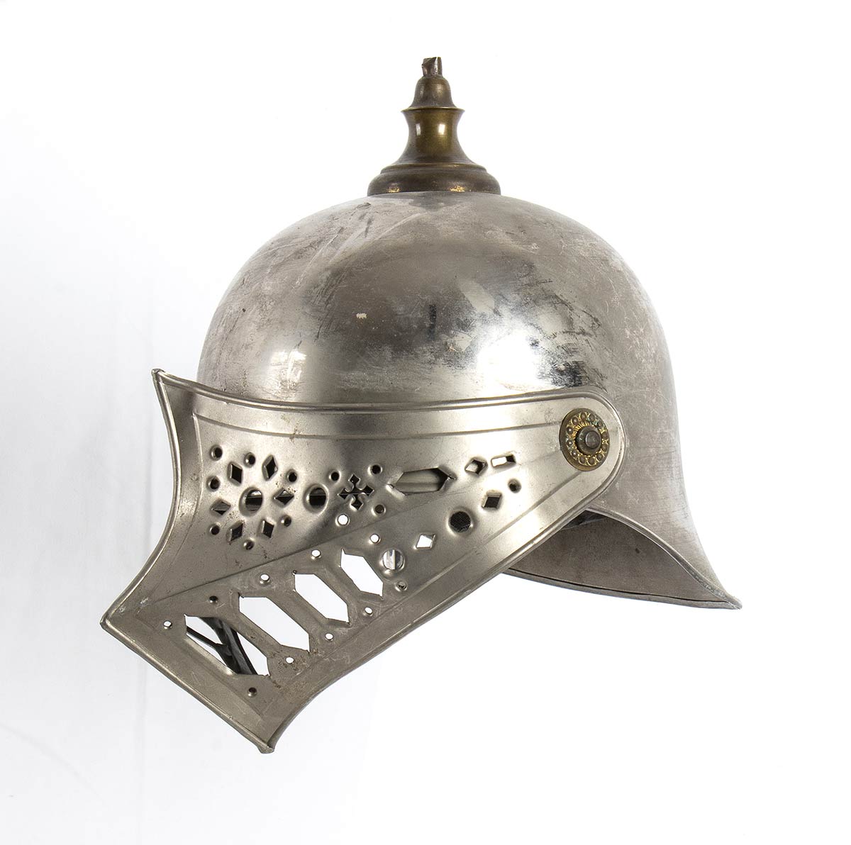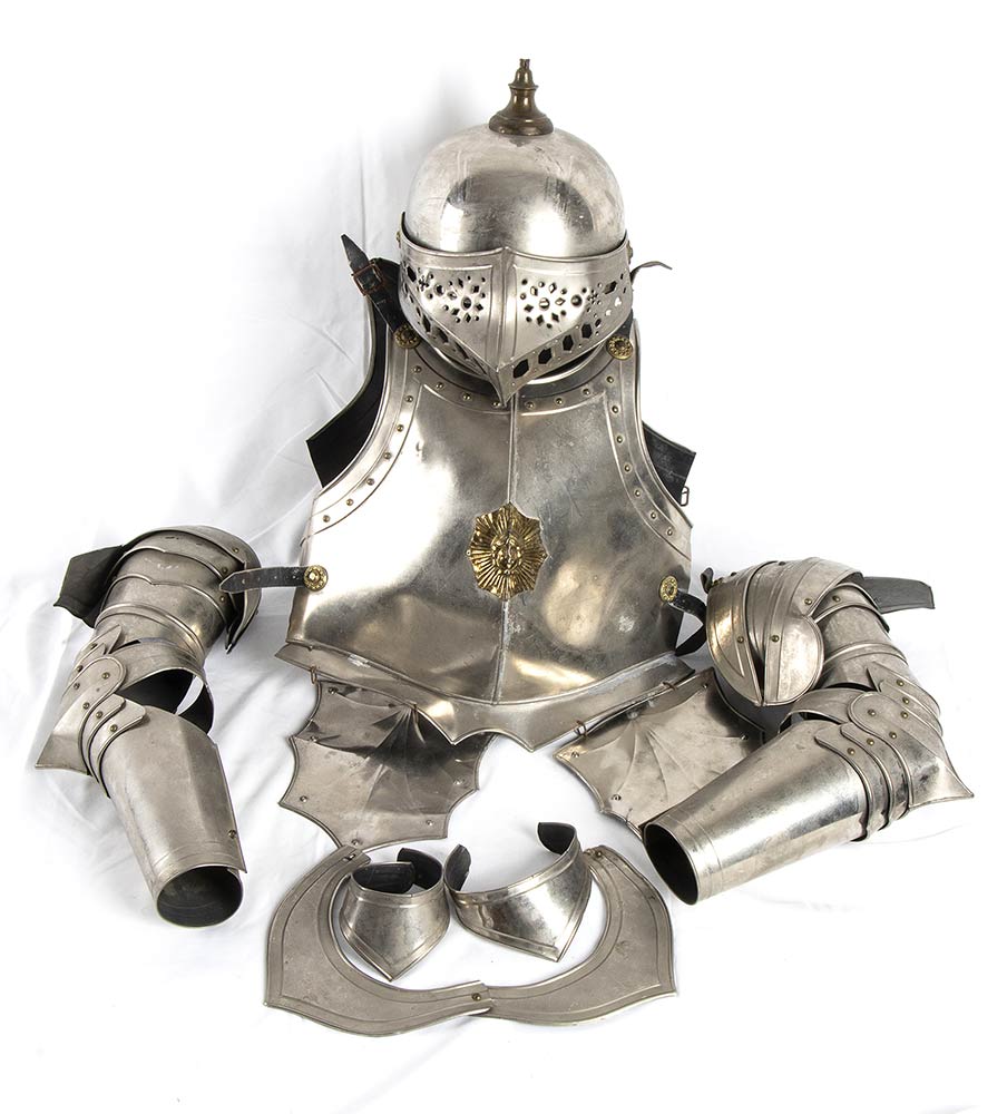 Simpatica armatura da cavaliere medievale, per bambino, composta da corazza, braccia, spalline, elmo con visiera apribile, dettagli in metallo dorato. All'interno dell'elmo cuffia in carta e tela, con marchio del produttore. In discrete condizioni.