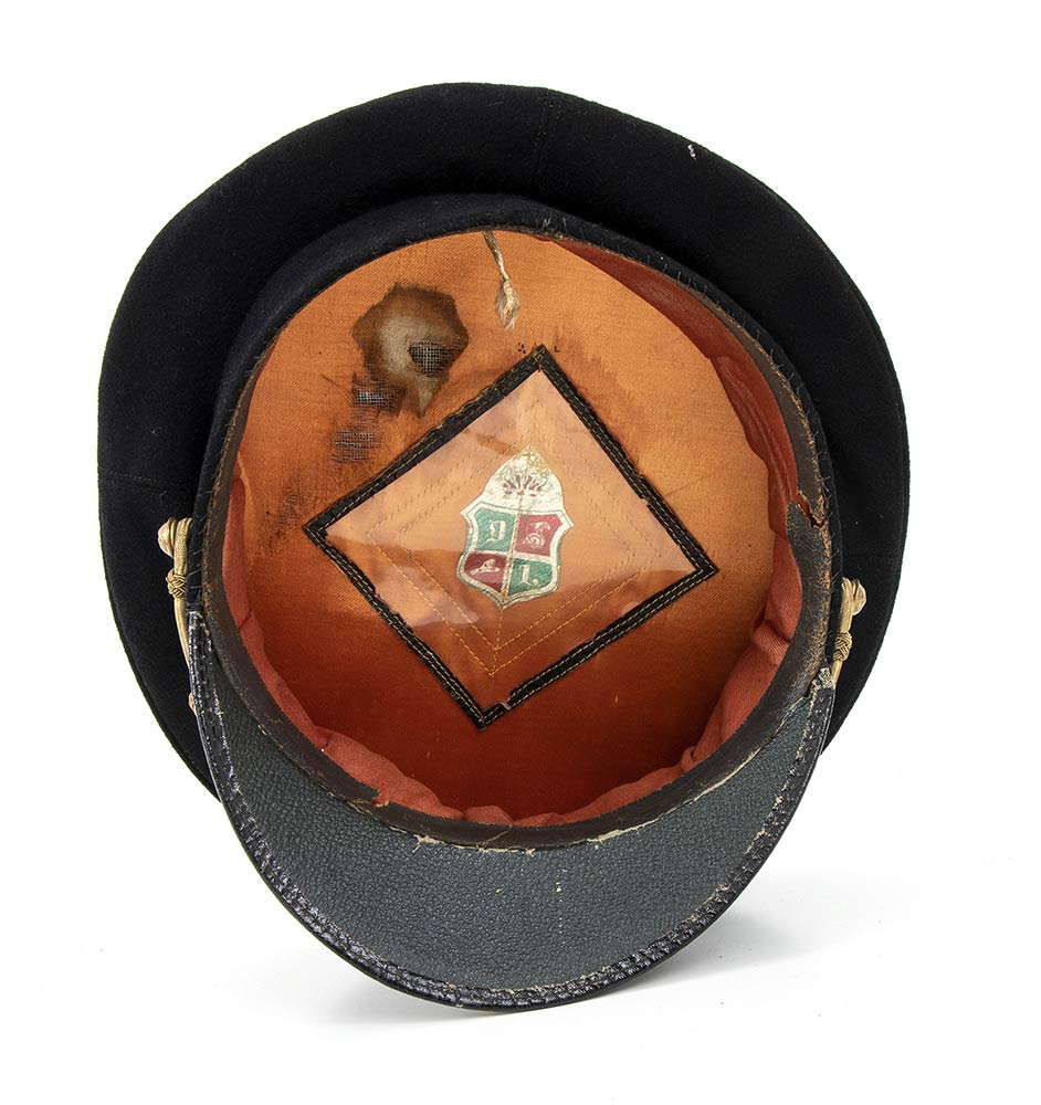 in panno di lana blu scuro/nero, con bellissimo fregio di canottiglia con fenice su bastoni di Borgogna incrociati, soggolo in tubolare dorato, bottoni semitondi con leone rampante, interno con alluda e marchi del fabbricante