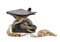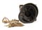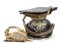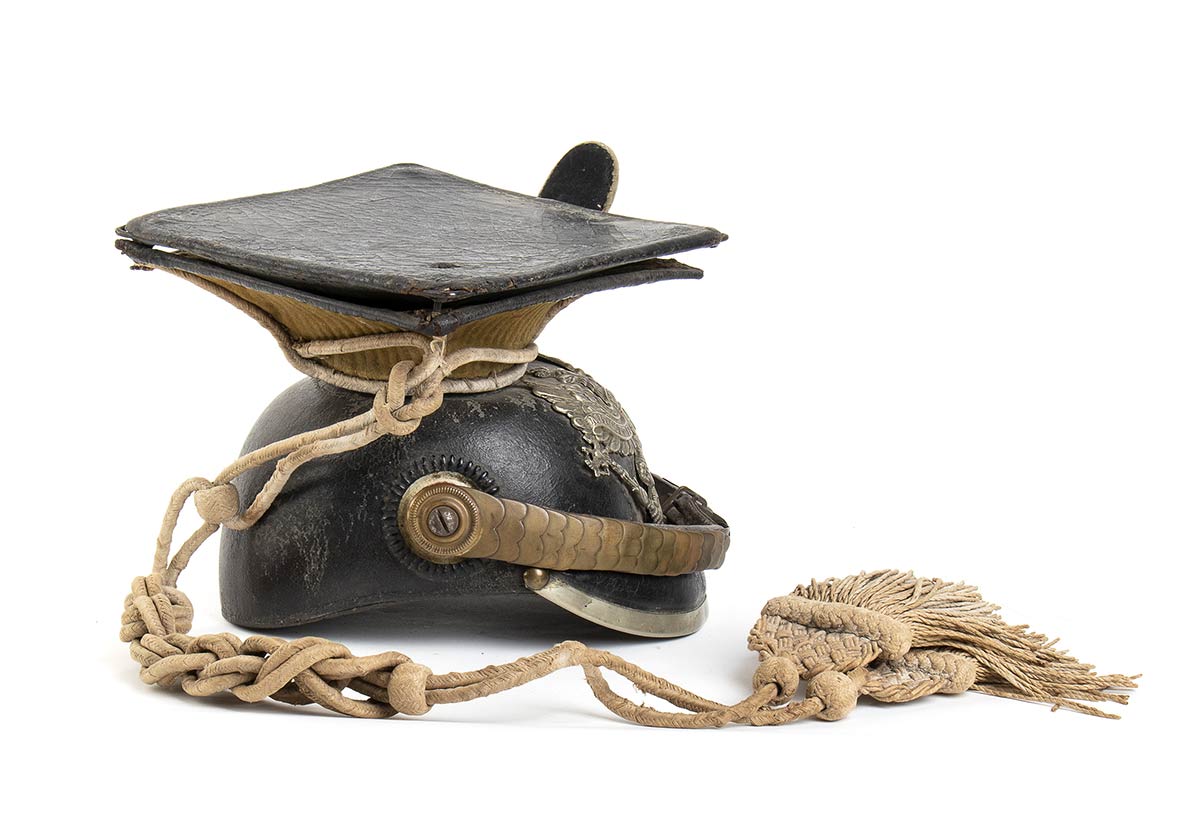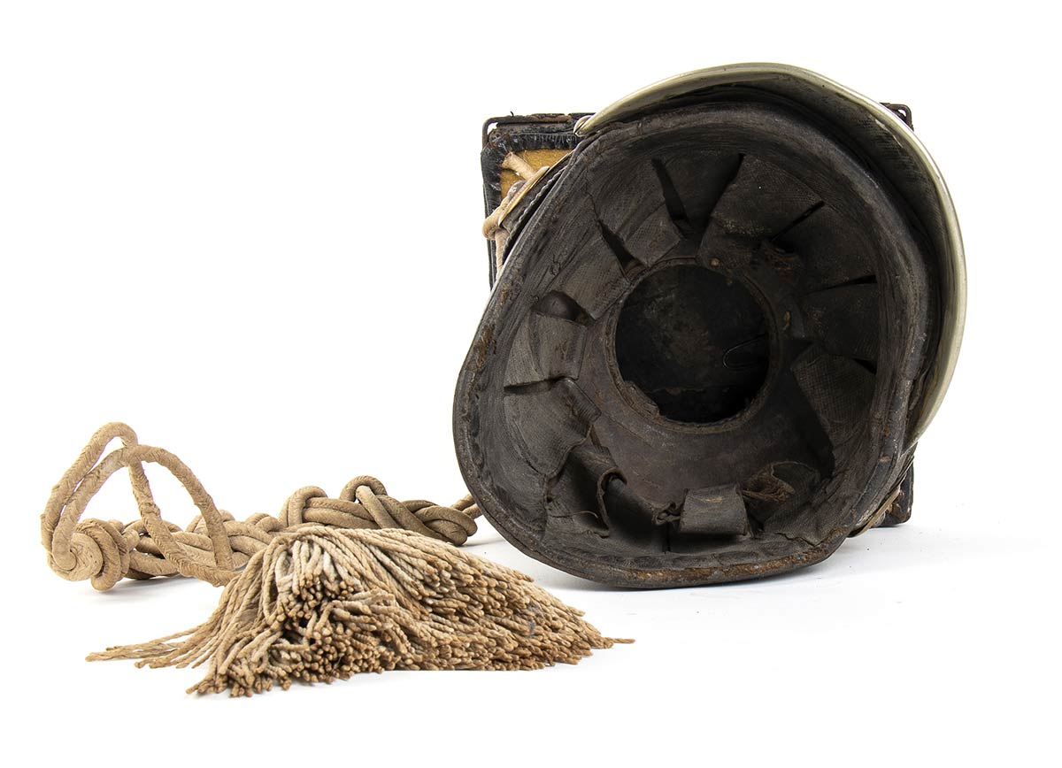 coppo in cuoio bollito con fregio in metallo bianco e soggolo a scaglie di ottone,capitello foderarto di giallo, cordoni, bianchi con racchette, interno di pelle reticolata sagomata a dente di lupo