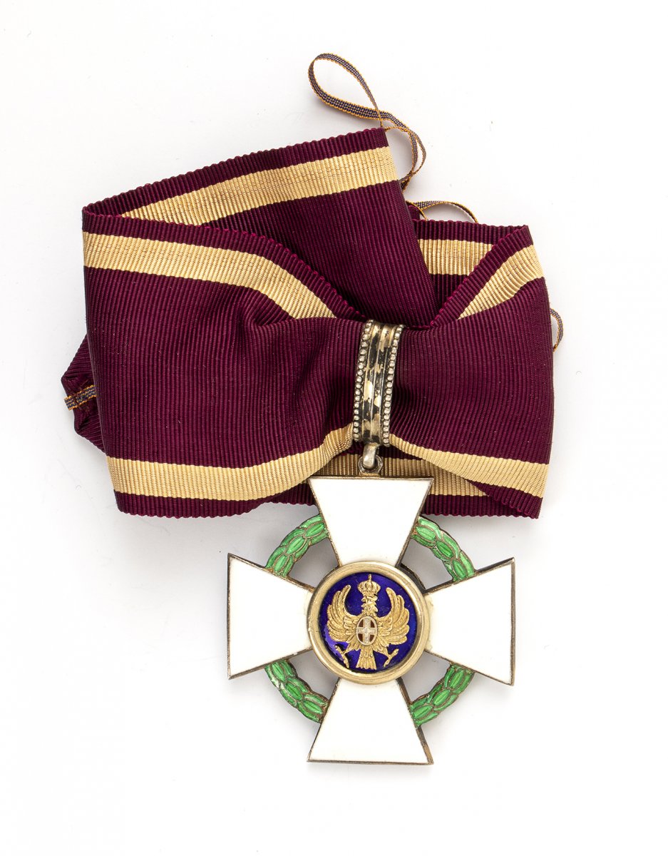 Argento dorato e smalti del primo tipo con aquila Sabauda, nastro coevo, di fine fattura.