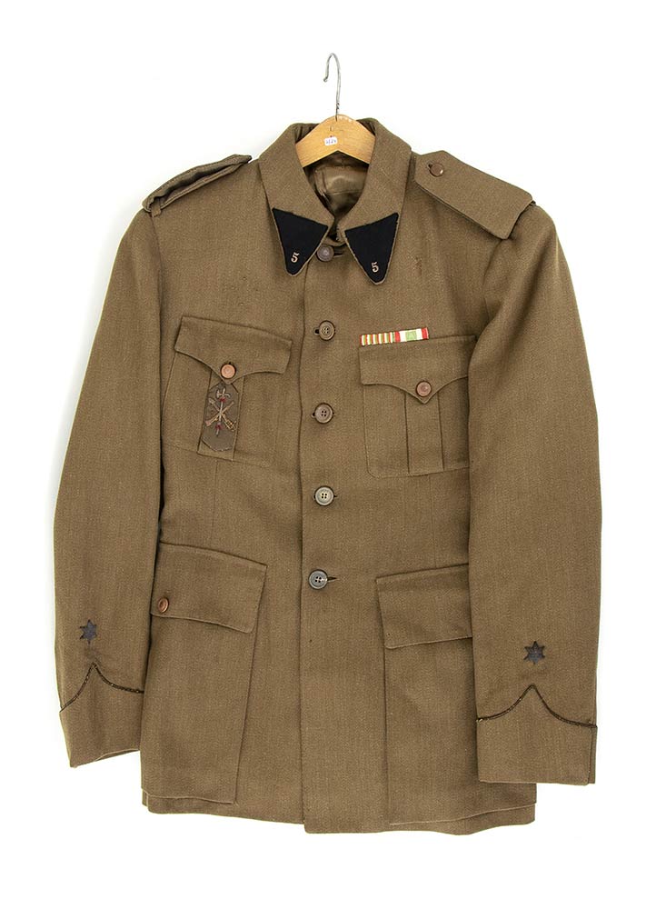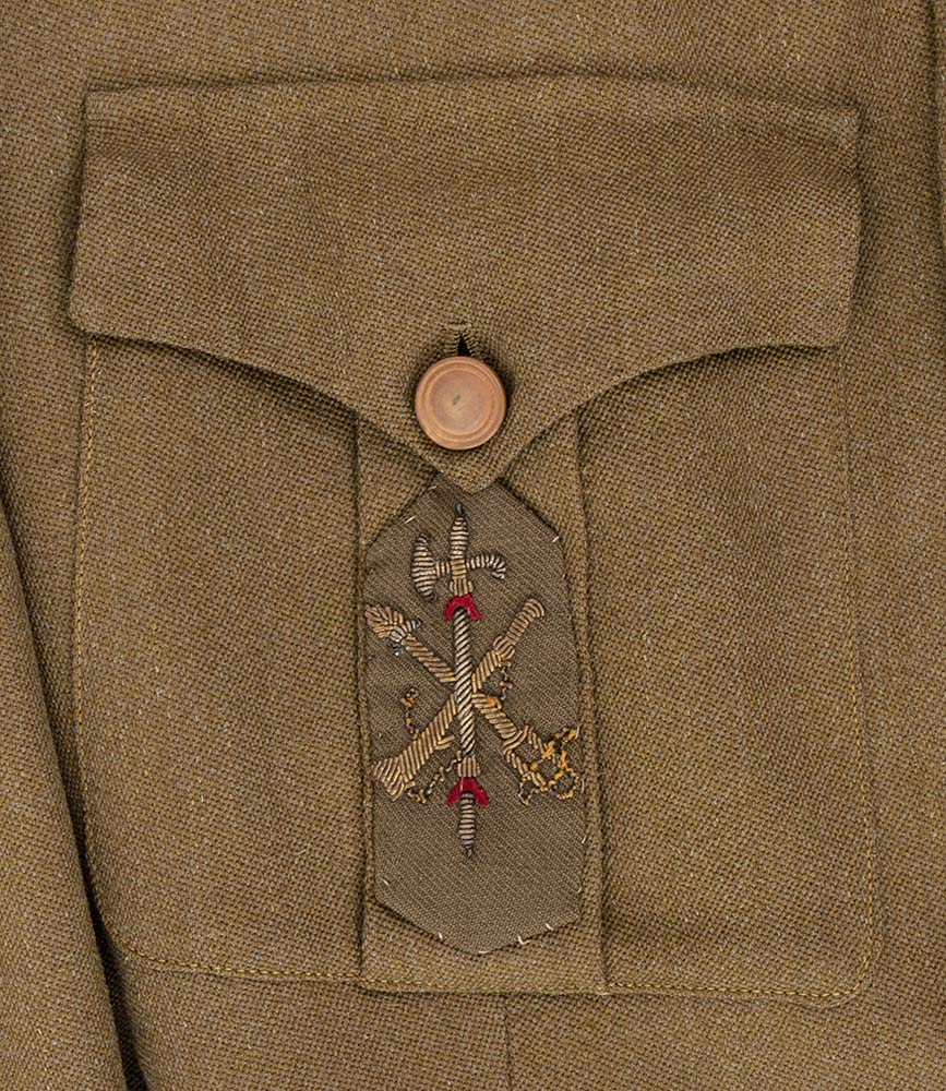 Giubba da sottotenente del battaglione d'assalto frecce nere di fattura spagnola, gradi sulla punta delle maniche, mostrine caricate del numero 5 metallico e distintivo del tercio de los extranjeros al petto