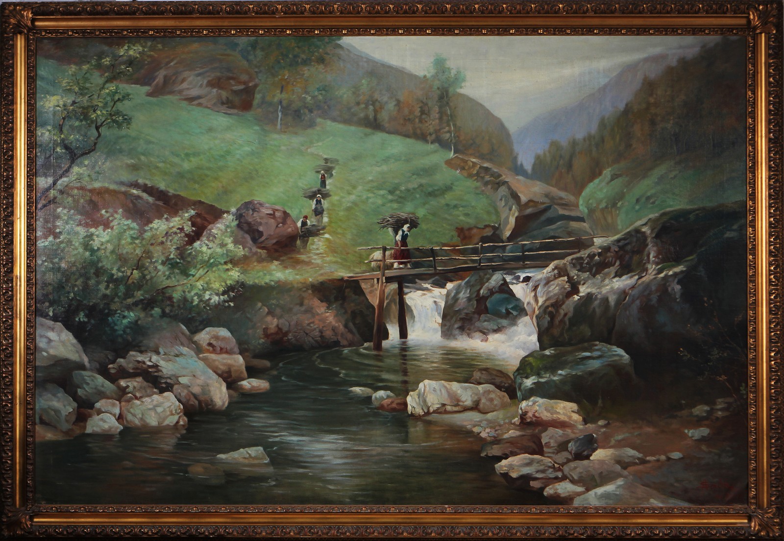 ANONIMO DELLA FINE DEL XIX SECOLO Torrente con cascate e contadini.,. Olio su tela . Cm 200,00 x 130,00. . Cornice presente