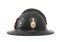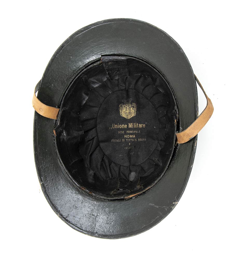 Feltro apprettato, pressato e verniciato grigioverde, fregio metallico con fondo di feltro robbio, nappina metallica sul lato sinistro, interno in cotone nero con impressioni dell'unione militare, completo di soggolo