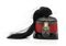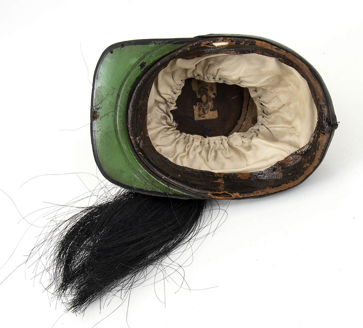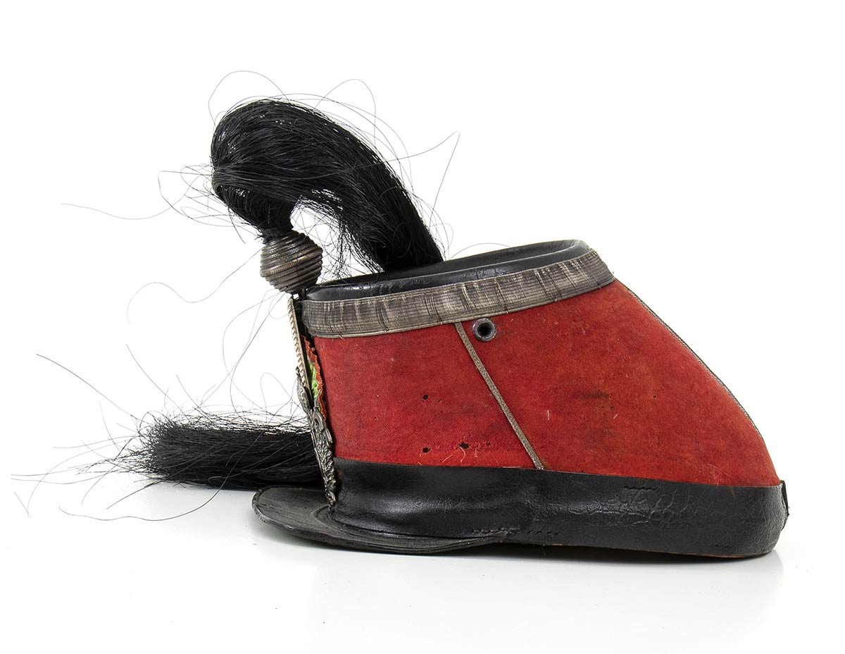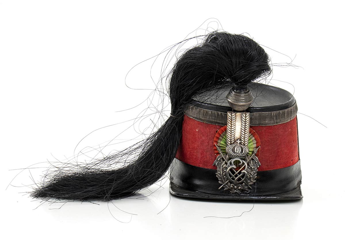 Corpo rigido ricoperto di panno rosso, montanti argento azzurro, grado a lastre d'argento con filettature azzurre, bel fregio in argento con cappio e coccarda, interno con alluda e cuffia di seta.