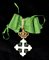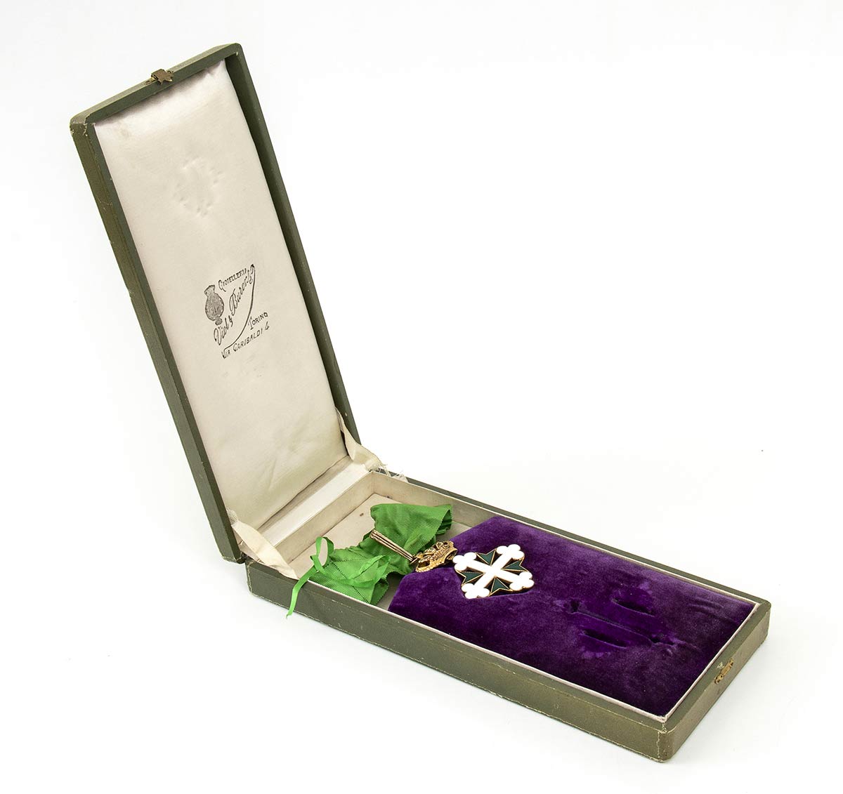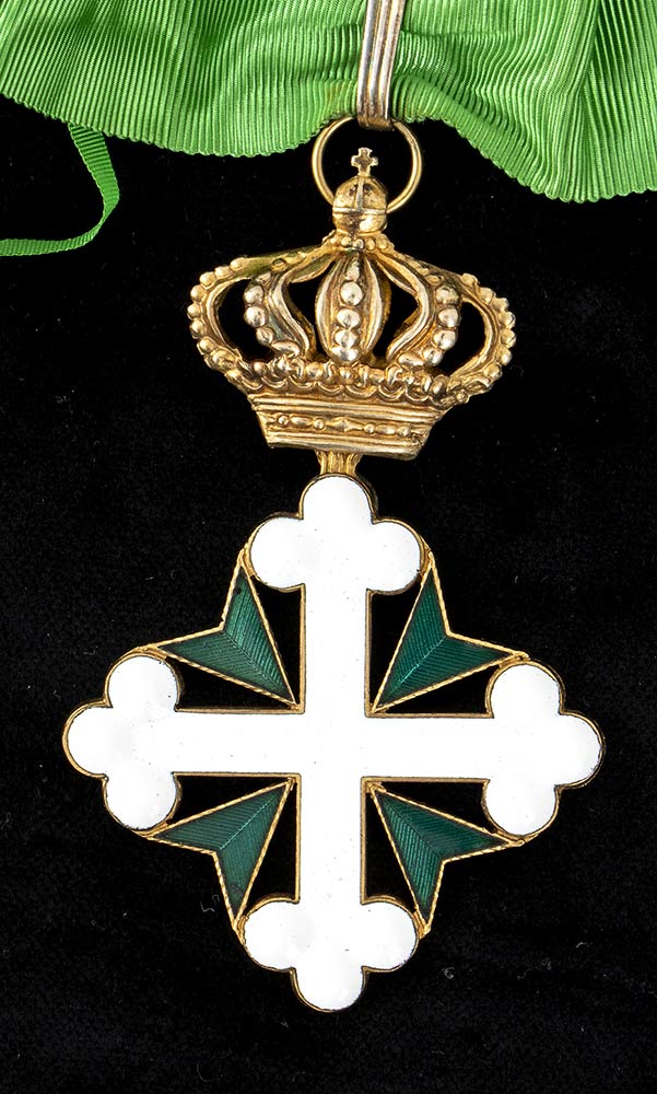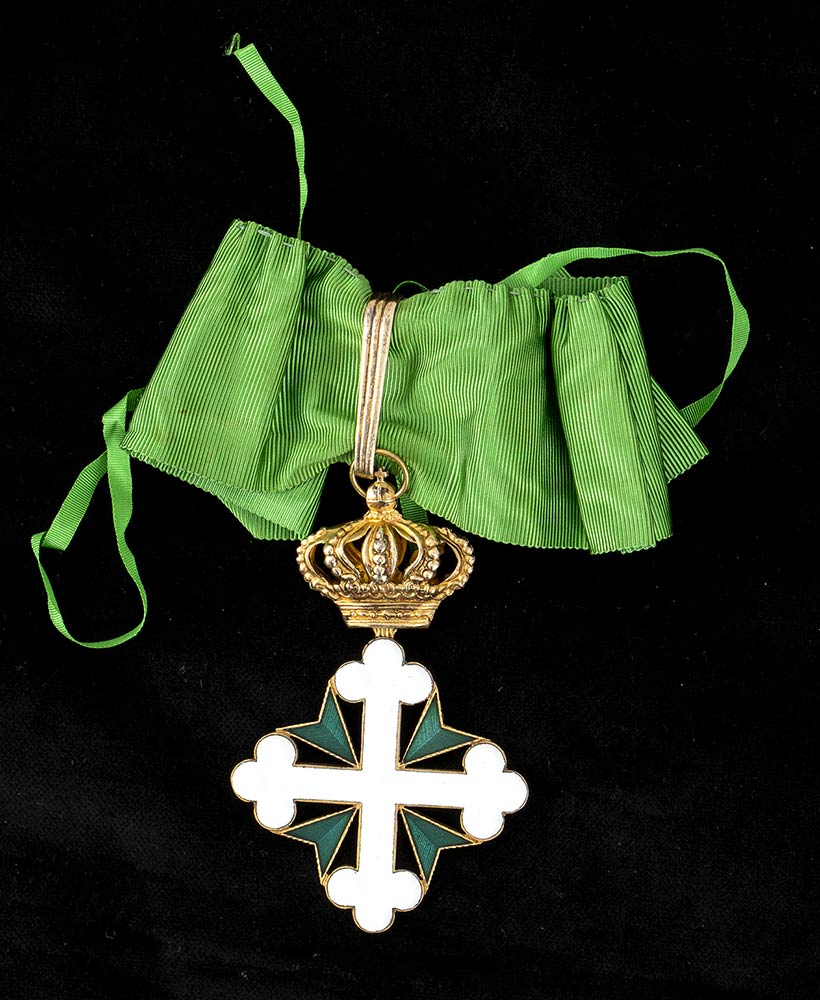 Insegna da collo di grandufficiale in argento dorato, smalti bianchi integri con pomelli poco sporgenti, nastro originale, conservata in astuccio, mancante di placca