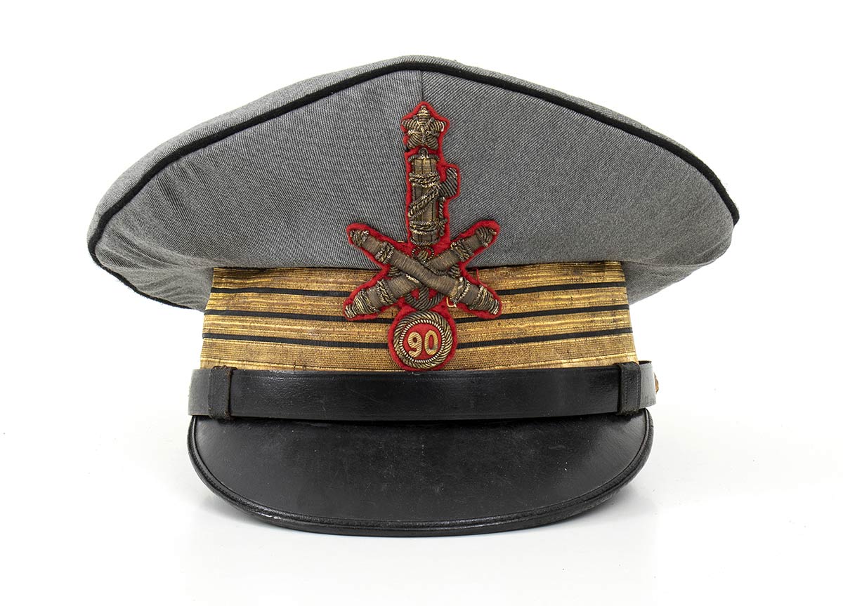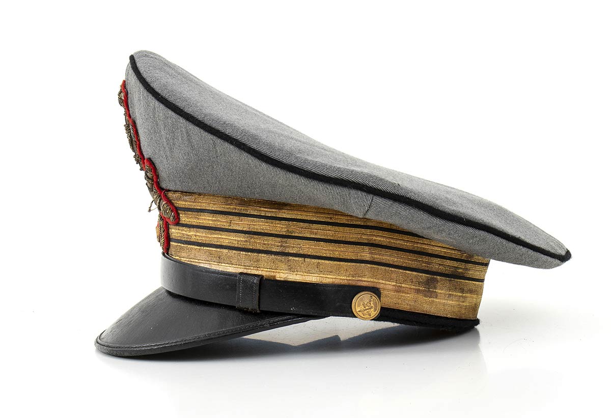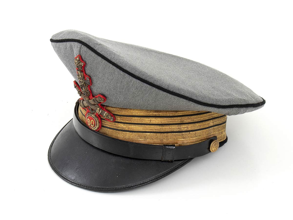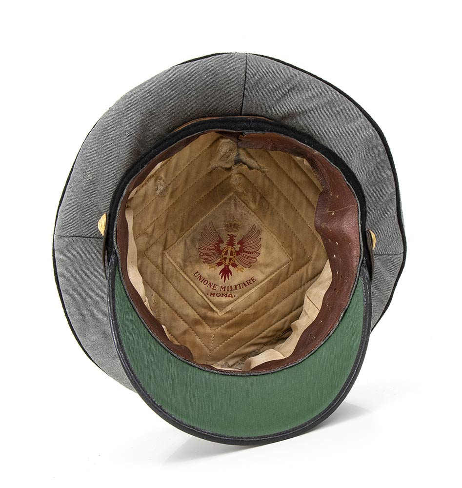 Bellissimo berretto m. 38 da console comandante la 9° Legione MILMART di Pantelleria. In gabardin grigio profilato di panno nero, tamburo nero con gradi a lastra filettati nero, bottoncini pertinenti, interno di seta trapuntata con marchio dell'unione militare