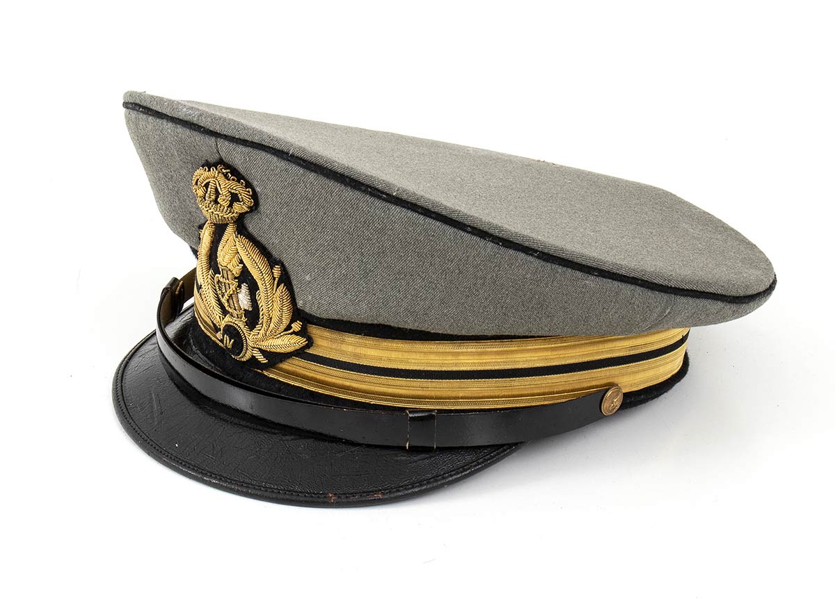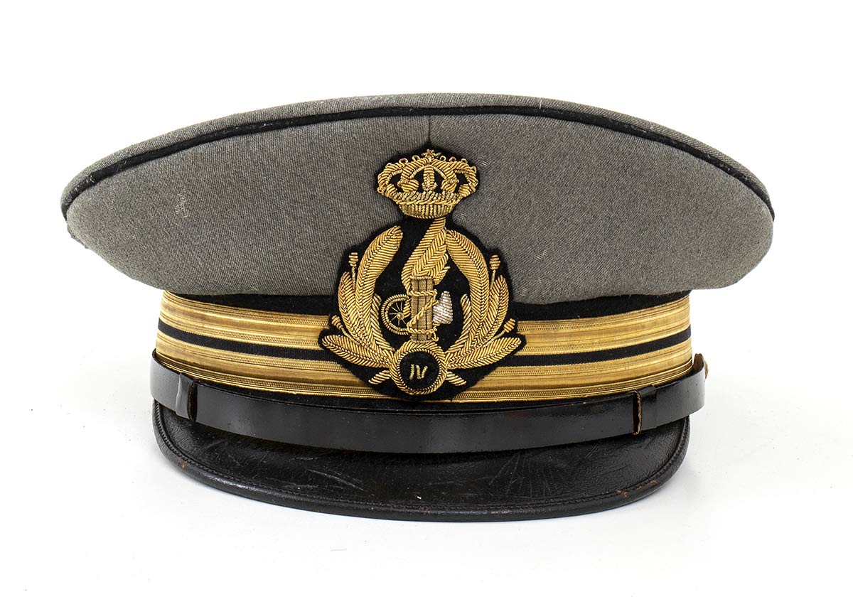 Gabardin con tamburo e filettatura di panno nero, bel fregio ricamato in canottiglia dorata, interno in seta cremisi, colore distintivo della milizia ferroviaria