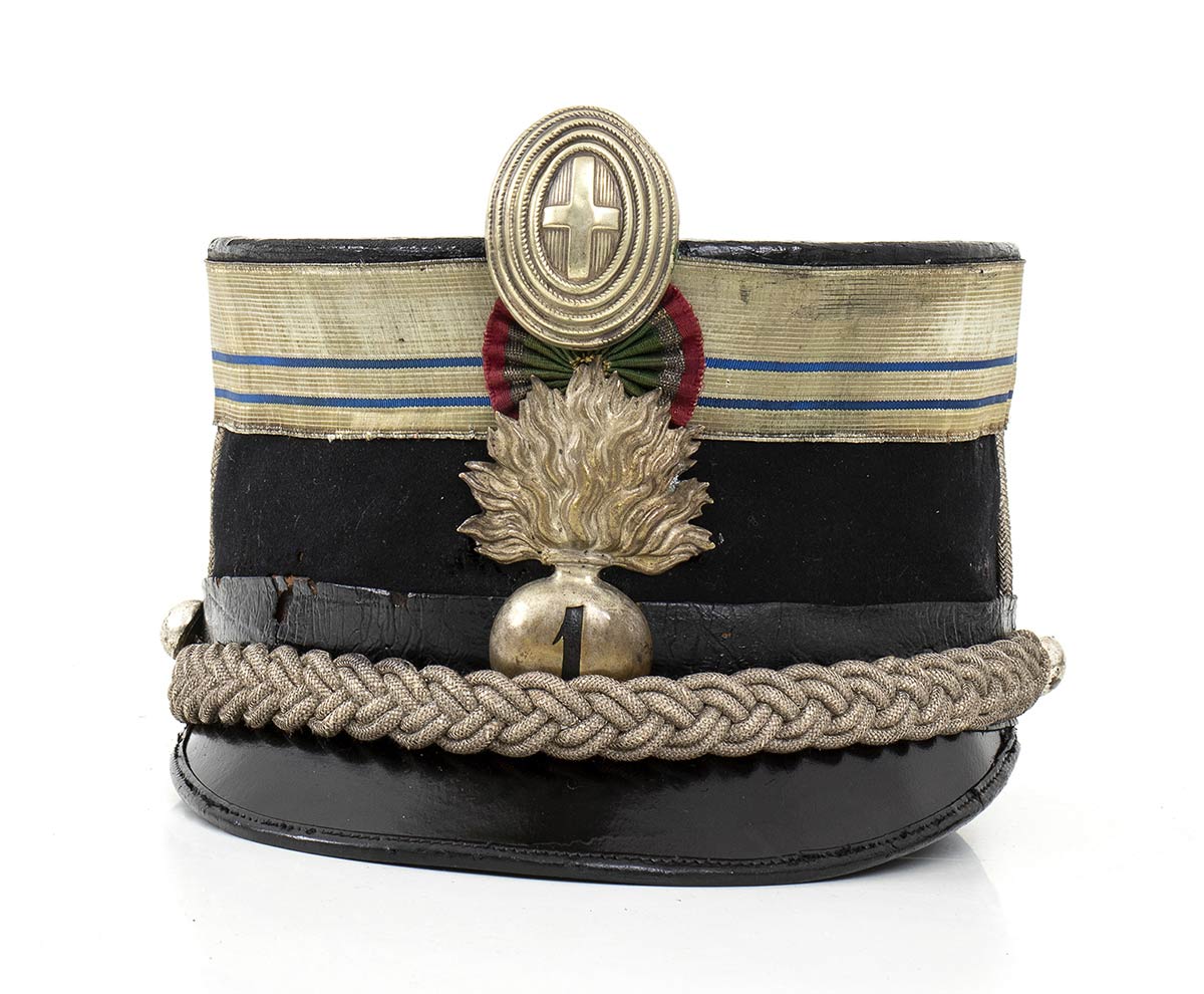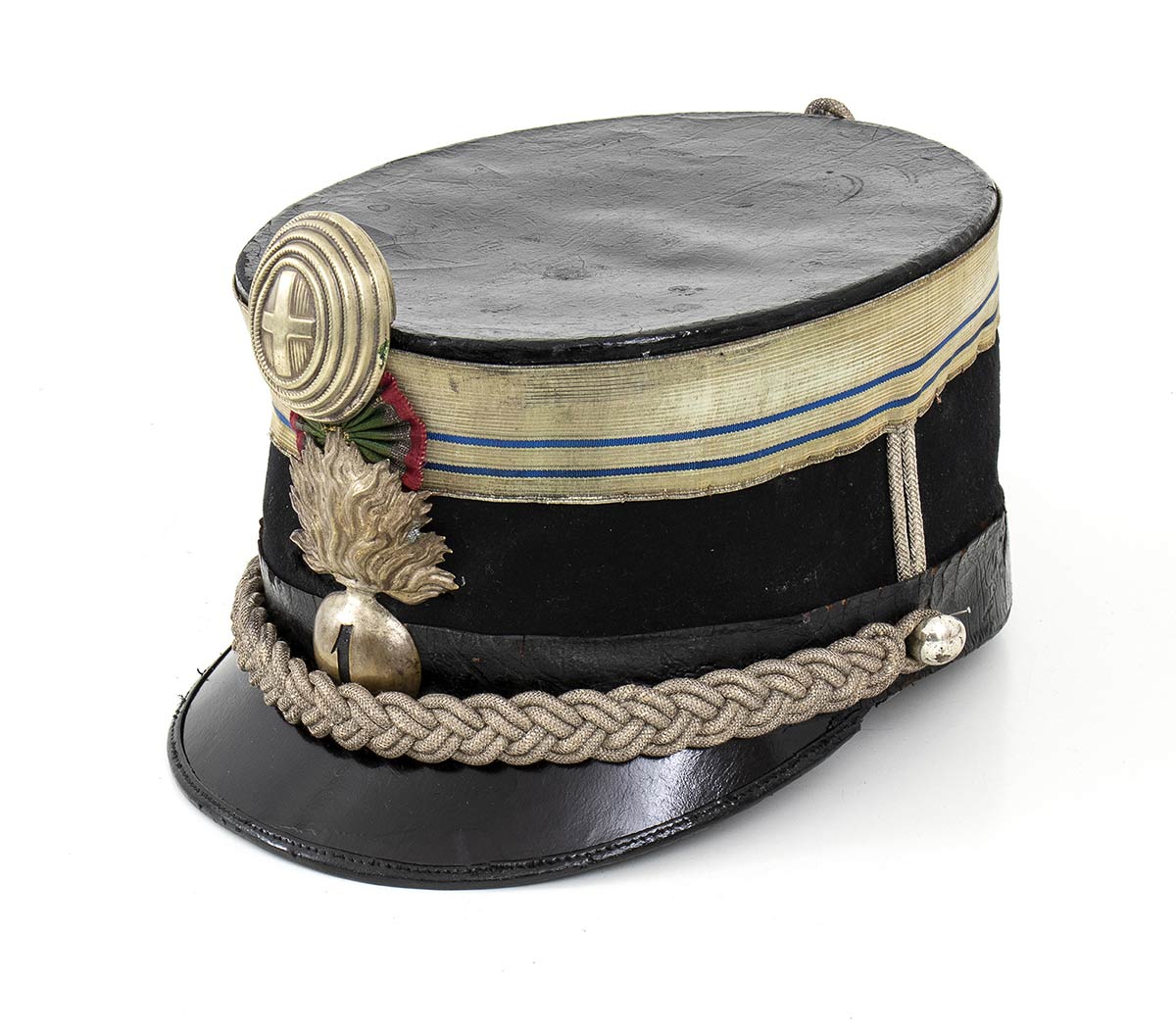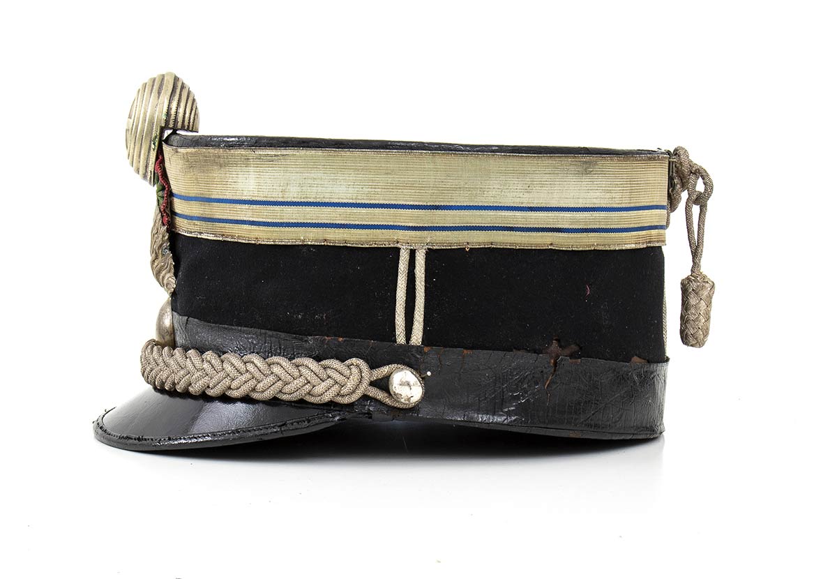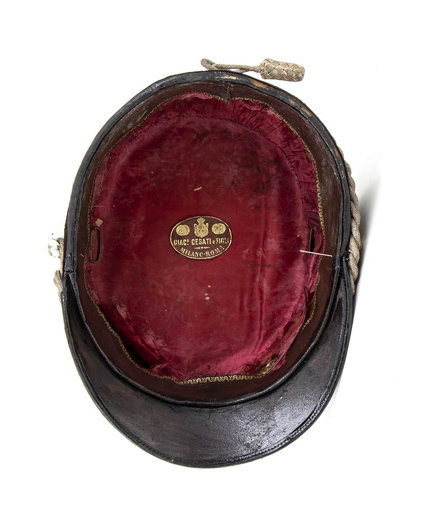Fusto cilindrico in galletta foderata di panno nero, gradi a lastra filettati azzurro,cordone argento, nappina marcata Cesati al verso così come la fodera interna, vissuto ma bello , senza buchi di tarma