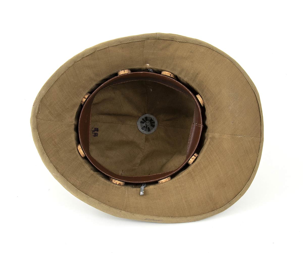 Mod. 28, in uso nel secondo conflitto, sughero ricoperto di cotone e foderato di cotone caki, bel fregio con impresso il numero del reggimento, senza soggolo