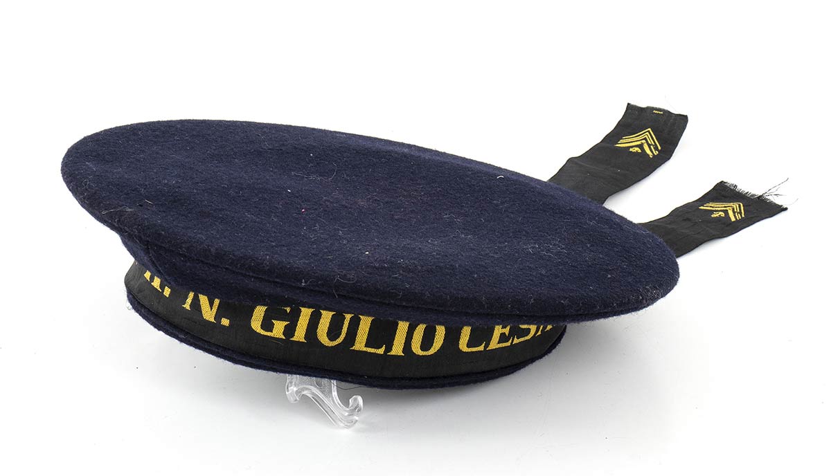 In panno di lana blu scuro foderato di rasatello di cotone nero ,con fascetta della corazzata Giulio Cesare