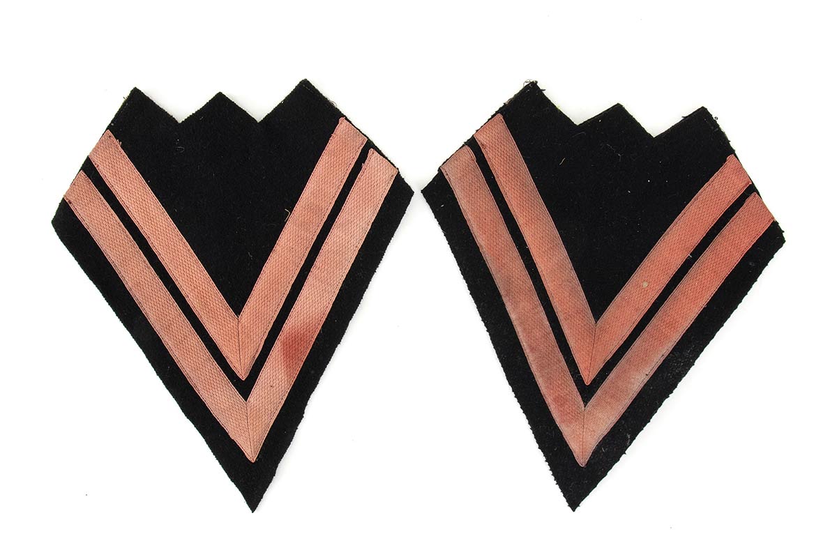Grande grado da braccio in panno di lana nero con applicate due strisce di grado in damina di cotone rosso
